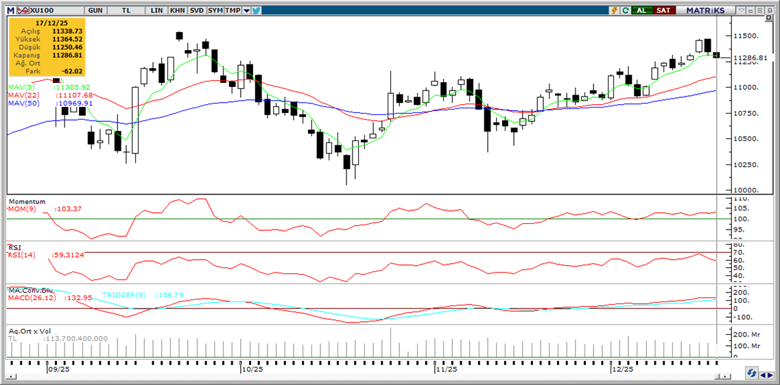 Günaydın. ABD’de Oracle’a dair finansman endişeleri tüm yapay zeka ekosistemine satış getirirken, bazı teknoloji şirketlerindeki aylık değer kayıpları %10’a ulaştı. ABD vadelileri bu sabah tepki arıyor, ancak Avrupa vadelileri ve Asya borsaları negatif bölgede. Borsa İstanbul’da da dün BIST 100 Endeksi %0,6 geriledi ve 11.250 / 11.300 destek bölgesinden (11.286) günü kapattık. Endekse en fazla pozitif katkı sağlayan ilk beş şirket TUPRS, TRALT, SAHOL, EREGL, PASEU olurken, endekse negatif etki edenler ise ASELS, BIMAS, AKBNK, GENIL, ASTOR oldu. Son bir haftada düzenli para girişi ile dikkat çeken şirketler ise THYAO, GARAN, PGSUS, AEFES, TCELL, SISE, ENJSA, TRMET ve MAVI. Para girişi devam eden endeks ağırlığı yüksek şirket sayısının artış göstermesini olumlu ve sağlıklı buluyoruz, ancak devam edip etmeyeceği izlenmeli. Teknik açıdan 11.360, 11.470 ve 11.605 seviyeleri direnç, 11.070 / 11.150 bandı ise destek alanı olarak takip edilebilir. Uzun vadeli değerlemeler ise BIST 100 endeksi için 12 aylık vadede 15.500 civarına işaret ediyor. Günün ajandasında İngiltere ve Avrupa MB kararları ve ABD enflasyon verileri öne çıkıyor. İçeride ise TCMB rezervleri ve haftalık yabancı işlemleri açıklanacak. Türkiye beş yıl vadeli CDS primleri bu sabah 210 baz puanda ve son yedi buçuk yılın en düşük seviyelerinde. CDS’lerdeki gevşemenin XBANK Bankacılık endeksi için destekleyici olduğunu ve Tacirler Yatırım Model Portföy’ünde GARAN ve ISCTR tercih ettiğimizi hatırlatalım. Model Portföy’deki diğer şirketler ise MGROS, THYAO, TUPRS, CCOLA, TKNSA, MAVI, FROTO, TAVHL ve TCELL.