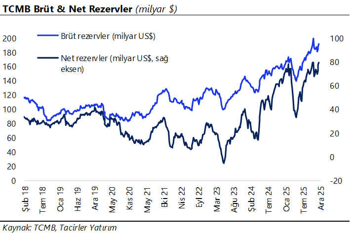 Analitik bilanço üzerinden yaptığımız hesaplamalar çerçevesinde 12 – 19 Aralık haftasında TCMB brüt döviz rezervinin 1,4 milyar dolar artışla 192,3 milyar dolara, net döviz rezervinin ise 0,8 milyar yükselerek 80,3 milyar dolara ulaştığını tahmin ediyoruz. TCMB’nin resmi rezerv verileri bu hafta, 25 Aralık Perşembe günü saat 14:30’da açıklanacak. Perşembe günü açıklanacak olan resmi verilerin, hesaplamamıza paralel bir artışı işaret etmesini bekleriz.