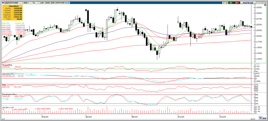 Günaydın. ABD’de yarından itibaren piyasalar açık olsa da idari tatil ilan edilmesi nedeniyle yıl sonu rehaveti hacimlerde düşüş, fiyat marjlarının sınırlanması ve yönsüz hareketler ile şimdiden kendini belli etmeye başladı. Bu görünüm Ocak ayına kadar devam edebilir. Bu sabaha bakarsak, ABD ve Avrupa vadelileri yatay, Asya’da ise karışık ancak dengeli bir görünüm var. Borsa İstanbul’da dün %0,3 ile hafif bir geri çekilme yaşansa da BIST 100 endeksi 11.300 üzerinde kalmayı başardı. Endekse en fazla pozitif katkı sağlayan ilk beş şirket AKBNK, DSTKF, ASELS, TRALT, YKBNK olurken, son bir haftada düzenli para girişi ile dikkat çeken şirketler ise AKBNK, MAVI, TAVHL ve CCOLA oldu. Teknik açıdan 11.470 ve 11.605 seviyeleri direnç, 11.250 ve 11.070 / 11.150 bandı ise destek alanı olarak devam ediyor. Uzun vadeli değerlemeler ise BIST 100 endeksi için 12 aylık vadede 15.500 civarına işaret etmeyi sürdürüyor. Günün ajandasında yoğun bir ABD takvimi dikkat çekiyor. Büyüme başta olmak üzere tüketim ve imalat odaklı veriler açıklanacak. Türkiye beş yıl vadeli CDS primlerinde gerileme sürüyor. Son fiyatlamalar 204 baz puan civarında ve son yedi buçuk yılın en düşük seviyelerinde. CDS’lerdeki gevşemenin XBANK Bankacılık endeksi için destekleyici olduğunu ve Tacirler Yatırım Model Portföy’ünde GARAN ve ISCTR tercih ettiğimizi hatırlatalım. Model Portföy’deki diğer şirketler ise MGROS, THYAO, TUPRS, CCOLA, TKNSA, MAVI, FROTO, TAVHL ve TCELL.