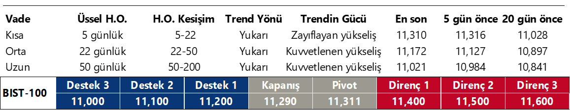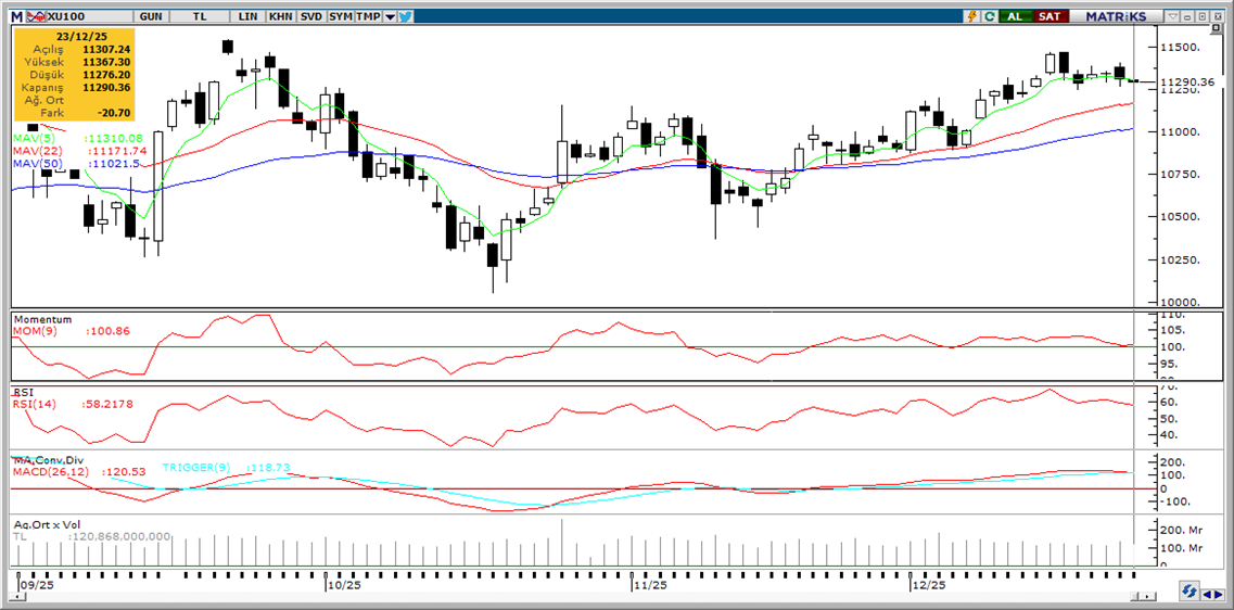 Günaydın. Küresel risk iştahı sınırlı, genel görünüm hafif negatif bir açılışa işaret ediyor. ABD’de yarın Noel nedeniyle resmi tatil ve tüm piyasalar kapalı olacak. Bugün ve Cuma günü ise federal tatil ilan edildi. Bu iki günde piyasalar açık olacak, ancak işlemler sınırlı kalabilir. İçeride, momentum kaybı devam ediyor ve henüz destekler kırılmasa da orta vadeli trend kanalları içinde görünüm zayıflıyor. Dün BIST 100 Endeksi %0,2 gerilerken endekse en fazla pozitif katkı sağlayan ilk beş şirket ASELS, TRALT, KTLEV, GENIL, HALKB; endekse negatif etki edenler ise AKBNK, BIMAS, YKBNK, SAHOL, EFOR oldu. Son bir haftada düzenli para girişi ile dikkat çeken şirketler ise ASELS, TRALT, AKBNK, GARAN ve EREGL. Teknik açıdan 11.470 ve 11.605 seviyeleri direnç, 11.250 ve 11.070 / 11.150 bandı ise destek alanı olarak devam ediyor. 11.300’ün hemen altında dünü tamamlayan endekste 11.250 desteğinin önemi artmış durumda. Bu seviye altında kısa vadeli görünüm daha belirgin şekilde negatife dönebilir. Uzun vadeli değerlemeler ise BIST 100 endeksi için 12 aylık vadede 15.500 civarına işaret etmeyi sürdürüyor. Günün ajandası sakin. Türkiye beş yıl vadeli CDS primlerinde gerileme hız kesti. Son fiyatlamalar 205 baz puan civarında ve son yedi buçuk yılın en düşük seviyelerinde devam ediyor. CDS’lerdeki gevşemenin XBANK Bankacılık endeksi için destekleyici olduğunu ve Tacirler Yatırım Model Portföy’ünde GARAN ve ISCTR tercih ettiğimizi hatırlatalım. Model Portföy’deki diğer şirketler ise MGROS, THYAO, TUPRS, CCOLA, TKNSA, MAVI, FROTO, TAVHL ve TCELL.