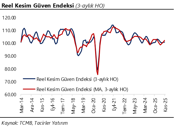 Yılın son ayına ilişkin reel kesim güven endeksi ve kapasite kullanım oranı verileri bugün saat 10:00’da açıklanacak. En alınan kasım verilerinde, arındırılmamış reel kesim güven endeksi (RKGE) 100,8 seviyesinde sabit kalırken, mevsim etkilerinden arındırılmış RKGE ise 102’den 103,2’ye çıkarak mart ayından bu yana en yüksek düzeyine ulaştı. Kapasite Kullanım Oranı (KKO) ise kasım ayında %74,2’den %74,4’e, mevsimsel etkilerden arındırılmış KKO ise %74’ten %74,1’e yükseldi. RKGE’yi oluşturan anket sorularına ait yayılma endekslerini incelediğimizde; son üç aydaki toplam sipariş miktarı, gelecek üç aydaki ihracat sipariş miktarı, mevcut toplam sipariş miktarı, gelecek üç aydaki üretim hacmi ve gelecek üç aydaki toplam istihdama ilişkin değerlendirmeler endeksi artış yönünde etkilerken, mevcut mamul mal stoku, genel gidişat ve sabit sermaye yatırım harcamasına ilişkin değerlendirmeler endeksi negatif etkilediği görülüyor. Son üç aya yönelik değerlendirmelerde ise, üretim hacminde ve ihracat sipariş miktarında artış bildirenler lehine olan seyrin bir önceki aya göre güçlendiği, iç piyasa sipariş miktarında azalış bildirenler lehine olan seyrin artış bildirenler lehine döndüğü görülüyor. Kasım verileri, hem güven endeksinde hem de kapasite kullanımında sınırlı bir iyileşmeye işaret ediyor. Üretim, ihracat ve istihdam beklentilerindeki toparlanma ise sanayi faaliyetlerinin yılın son çeyreğine ılımlı bir momentumla girdiğini gösteriyor. Bu noktada, 2025 yıl sonu büyüme tahminimizi yakın dönemde %3,4’ten %3,8’e revize ettiğimizi hatırlatmak isteriz.