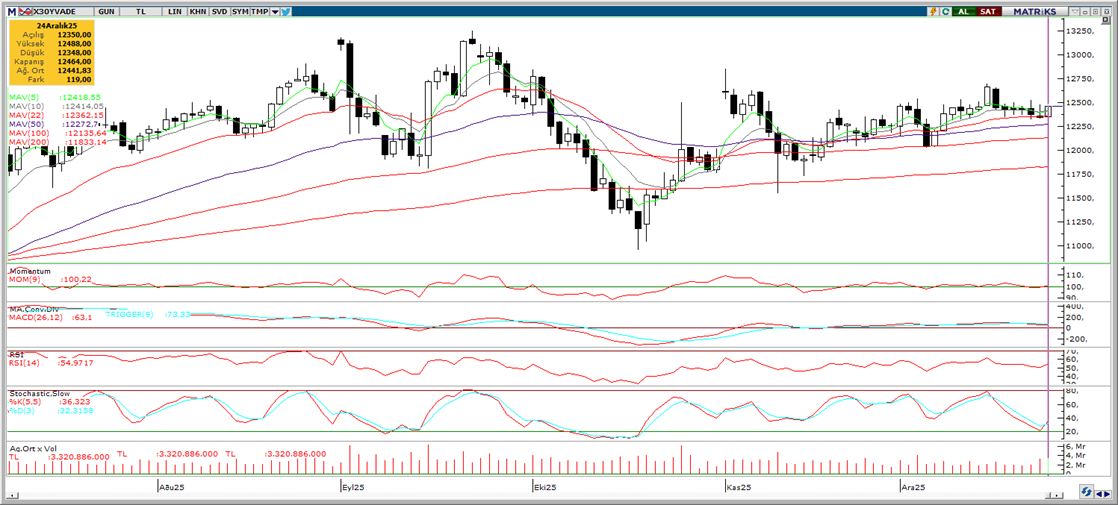 4.526$ ile tarihi zirvesini yenileyen ons altın için teknik görünüm, kısa vadede fiyatın 4.250$ – 4.500$ bandında hareket edebileceğine işaret ederken, 4.500$ seviyesi üzerinde kâr realizasyonu kaynaklı sınırlı satış baskısı oluşma ihtimali öne çıkmaktadır. 4.380$, 4.330$ ve 4.270$ seviyeleri destek, 4.500$ seviyesi ise direnç olarak izlenmektedir. Noel tatili nedeniyle düşük işlem hacimlerinin etkili olması, fiyat hareketlerinin teknik seviyeler etrafında daha sınırlı seyretmesine neden olabilir.