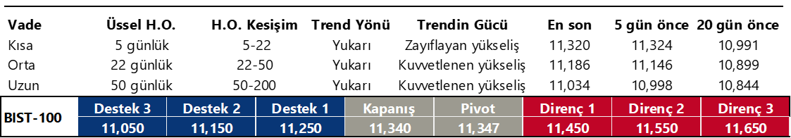 Günaydın. ABD borsaları, bugünkü Noel tatili öncesinde dünü zirve tazeleyerek kapattılar. Küresel risk iştahı bu sabah yatay, tatil etkileri daha belirgin şekilde hissediliyor. Bununla beraber, gelecek yıla dair beklentileri ABD ve Avrupa borsaları için pozitif seyrin süreceğine işaret ediyor. Borsa İstanbul’da, BIST 100 endeksi dün %0,44 yükselişle yeniden 11.300 üzerine yönelirken endekse en fazla pozitif katkı sağlayan ilk beş şirket BIMAS, ASELS, TUPRS, SAHOL, KCHOL; endekse negatif etki edenler ise AKBNK, TRALT, YKBNK, EFOR, ISCTR oldu. Son bir haftada düzenli para girişi ile dikkat çeken şirketler ise ASTOR, EREGL, GARAN, TRENJ, ASELS, CWENE ve BRSAN oldu. Yatırımcılardan gelen sorular üzerine anlıyoruz ki, para giriş – çıkışı konusunda bazı soru işaretleri var. Bu verileri, yerli ve yabancı işlemleri dahil tüm işlemler üzerinden, kurumlar ve şirketler bazında ayrı ayrı ve günlük bazda alıcı – satıcı dengesine dikkat ederek hesapladığımızı ve bir seri oluşturarak takip ettiğimizi belirtelim. Bu konulardaki detaylı açıklamalarımızı Tacirler Yatırım Youtube kanalımızda yaptığımız yayınlarda detayları ile açıklıyoruz. BIST 100 endeksine teknik olarak baktığımızda, kısa vade için 11.400 / 11.470 bandı ve 11.605 seviyeleri direnç, 11.250 ve 11.070 / 11.150 bandı ise destek alanı olarak takip edilebilir. Uzun vadeli değerlemeler ise BIST 100 endeksi için 12 aylık vadede 15.500 civarına işaret etmeyi sürdürüyor. Günün ajandasında içeride reel kesim güveni, rezervler ve yabancı işlemleri izlenecek. Türkiye beş yıl vadeli CDS primleri 205 baz puanda yatay ve son yedi buçuk yılın en düşük seviyelerinde kalmaya devam ediyor.