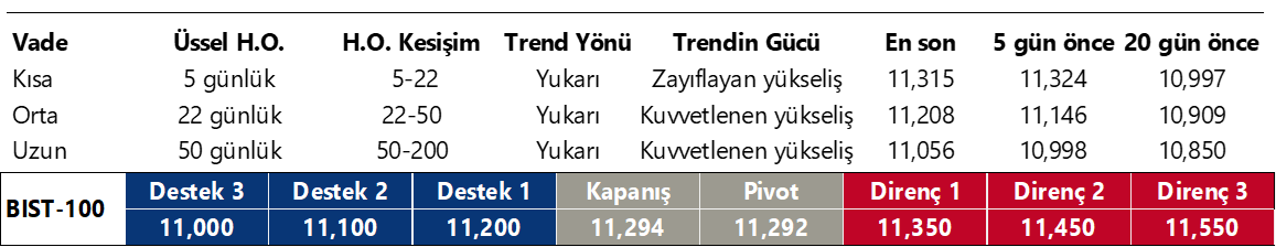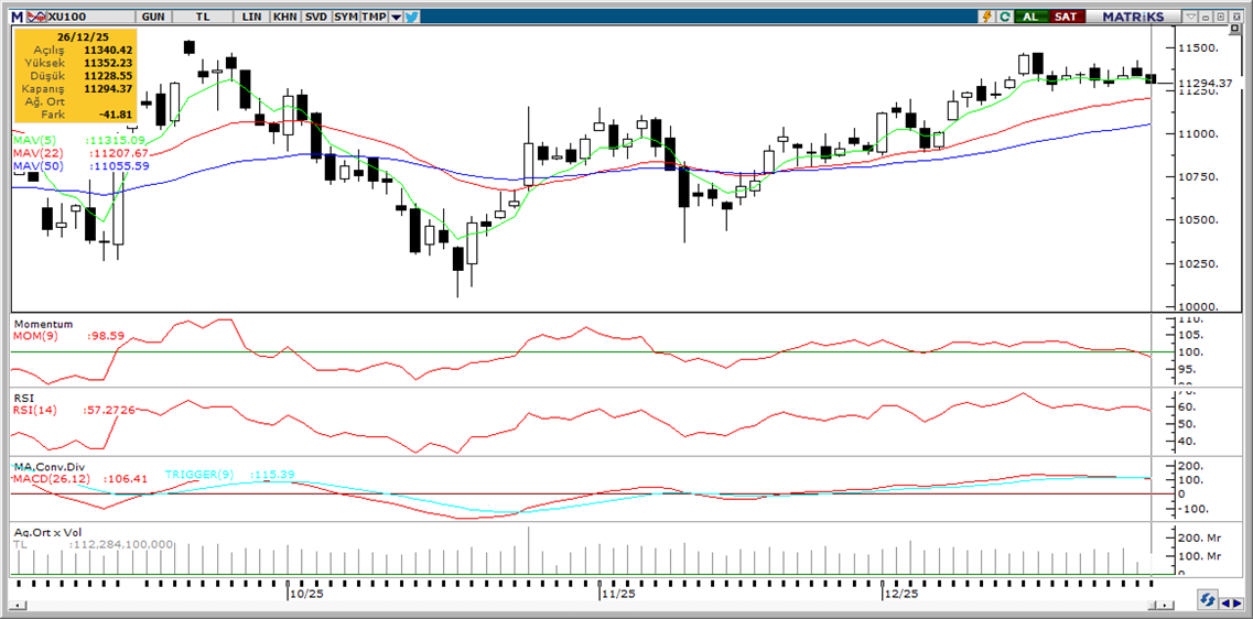 Günaydın. Küresel piyasalarda yıl sonu hacimsiz ve dar bantlara sıkışan işlemler devam ediyor. Özellikle ABD piyasalarında bu etkiyi daha fazla görüyoruz. Avrupa vadelileri ve Asya borsaları ise yeni haftaya biraz daha istekli bir başlangıç yapıyor. Borsa İstanbul’da Cuma günü yüksek para girişine ve artan hacme karşın, para girişi daha çok endeks dışı şirket hisselerinde yoğunlaştığından BIST 100 endeksi zayıf bir seyir izledi ve günü %0,4 gerileme ile 11.300’ün hafif altında kapattı. Yaklaşık olarak iki haftadır benzer şekilde, endeksin 11.300 civarında salındığını görüyoruz ve kısa vadede bu görünümde önemli bir değişim beklemiyoruz. Cuma günü endekse en fazla pozitif katkı sağlayan ilk beş şirket ASELS, MAGEN, ASTOR, AKSEN, GUBRF olurken, geçen hafta düzenli para girişi ile dikkat çeken şirketler ise ASELS, TOASO, AEFES ve GESAN oldu. Teknik açıdan kısa vade için 11.400 / 11.470 bandı ve 11.605 seviyeleri direnç, 11.250 ve 11.070 / 11.150 bandı ise destek alanı olarak takip edilebilir. Cuma günü “2026 Görünüm“ raporumuzu yayımladık. 12 Aylık endeks hedefimiz 15.200, piyasa ortalama beklentisi ise 15.660. Küresel beklentilerimiz, Türkiye’ye ilişkin makro tahminlerimiz, Model Portföy revizyonlarımız (TKNSA çıktı, ASTOR, SAHOL ve MPARK girdi) ve sektör / şirket beklentilerimizi raporumuzda görebilirsiniz. Günün ajandası sakin, Türkiye beş yıl vadeli CDS primleri 205 baz puanda yatay.
