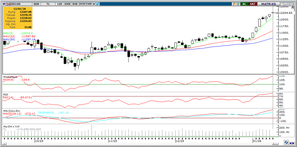 Günaydın. Güne, ABD Başkanı Trump’ın “İran ile iş yapan ülkelere %25 ek gümrük vergisi” açıklaması ile başlıyoruz. Bu gelişmenin ekonomik etkilerinden çok, İran’a yönelik baskının artırılması ve jeopolitik stresin sürdürülmesi açısından okunması gerekiyor. Küresel piyasalar bu sabah sakin, ABD vadelileri hafif negatif, Avrupa vadelileri hafif pozitif, Asya ise ortalamada alıcılı bir seyir izliyor. 2025 yılı 11 aylık verilere göre, Türkiye’nin ithalatında İran’ın payı %0,7, ihracatında ise %1,1. Bu oranlar düşük olsa da haber akışına bağlı algı fiyatlaması bugün Borsa İstanbul’da sınırlı bir baskı yaratabilir. BIST’te dün %0,44 yükselişle 12.255 puandan kapanış yaşanırken gün içinde 12.378 seviyesi test edildi. Geçmişte de paylaştığımız gibi, son yükselişin ivme kaybedebileceği bir soluklanma bölgesi olan 12.200 / 12.500 bölgesine gelmiş bulunuyoruz. 12.500 üzerinde 12.800 / 13.000 direnç bölgesi takip edilebilir, ancak öncesinde bir süre bekleyebiliriz. 12.000 / 12.200 bandı ise destek alanı olarak izlenebilir. Endekse dün en fazla pozitif katkı sağlayan ilk beş şirket BIMAS, TUPRS, ASELS, KCHOL, ASTOR olurken, son bir haftada düzenli para girişi ile dikkat çeken şirketler ise THYAO, TUPRS, TRALT, KCHOL, BIMAS, ASTOR, SAHOL ve ULKER oldu. Günün ajandasında içeride cari denge, ABD’de TÜFE verileri izlenecek. Türkiye 5 yıl vadeli CDS primleri ise güne 216 baz puandan başlıyor.