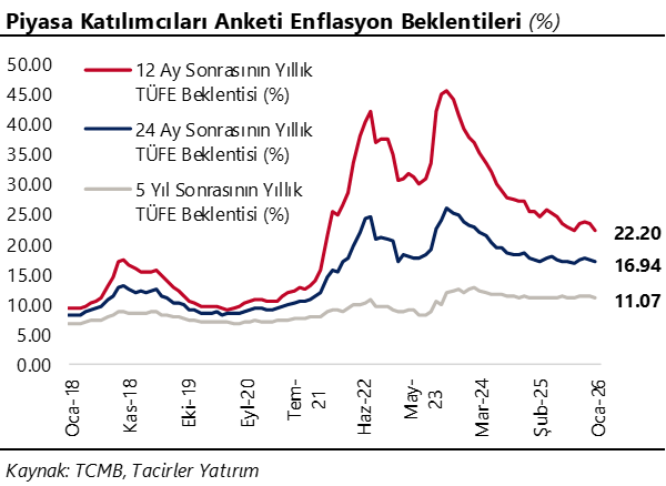 TCMB’nin Ocak 2026 dönemine ilişkin Piyasa Katılımcıları Anketi sonuçlarına göre katılımcıların 2026 yıl sonu TÜFE beklentisi %23,4’ten %23,2’ye gerilerken, 2027 yıl sonu TÜFE beklentisi ise %17,5’ten %17,8’e yükseldi. Ayrıca, 24 ay sonrasına ilişkin TÜFE beklentisi %17,5’ten %16,9’a, 5 yıl sonrasına ilişkin yıllık TÜFE beklentisi ise %11,4’ten %11,1’e geriledi. Katılımcıların aylık TÜFE artışı beklentileri ocak için %3,8, şubat için ise %2,05 seviyesinde oluştu. Aralık ayı anketinde ocak ayına ilişkin aylık TÜFE beklentisi %3,44 seviyesindeydi. Kurum olarak ocak ayı aylık TÜFE artışının %4’ün üzerinde gerçekleşmesini bekliyoruz. 2026 yıl sonu TÜFE tahminimiz %23 seviyesinde bulunurken, çekirdek göstergelerdeki sınırlı iyileşme, hizmet enflasyonundaki katılık ve gıda fiyatlarındaki oynaklık nedeniyle tahminimize yönelik risklerin yukarı yönlü olduğunu değerlendiriyoruz. Piyasa katılımcıları Para Politikası Kurulu’nun (PPK) 22 Ocak 2026’da gerçekleşecek toplantısında politika faizinin 150 baz puan indirimle %36,5 seviyesinde oluşmasını bekliyor. Piyasa katılımcıları, 12 Mart 2026 toplantısında ise politika faizini %35,1 seviyesinde öngörüyor. Dolayısı ile katılımcılar, ocak ve mart toplantılarında 150’şer baz puanlık faiz indirimi bekliyor. 2026 yıl sonu politika faizi beklentisi ise %28 düzeyinde oluşmuş durumda. Kurum olarak, PPK’nın 22 Ocak’ta gerçekleştireceği toplantısında politika faizinin 150 baz puan indirimle %36,5 seviyesine çekilmesini bekliyoruz. Bununla birlikte, mevcut makro görünüm ve risk dengesi, daha temkinli bir indirimin de masada olduğunu düşündürüyor. Bu çerçevede baz senaryomuz 150 baz puanlık bir indirim olmakla birlikte, 100 baz puanlık bir indirim ihtimalini de göz ardı etmiyoruz. 200 baz puan ve üzeri bir indirim ise beklemiyoruz. Ayrıntılı rapor için tıklayınız.
