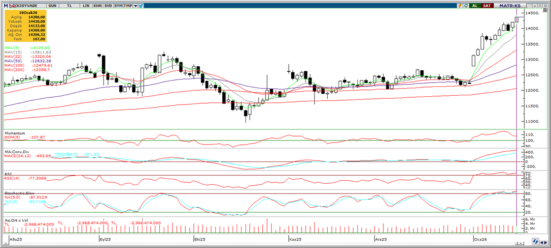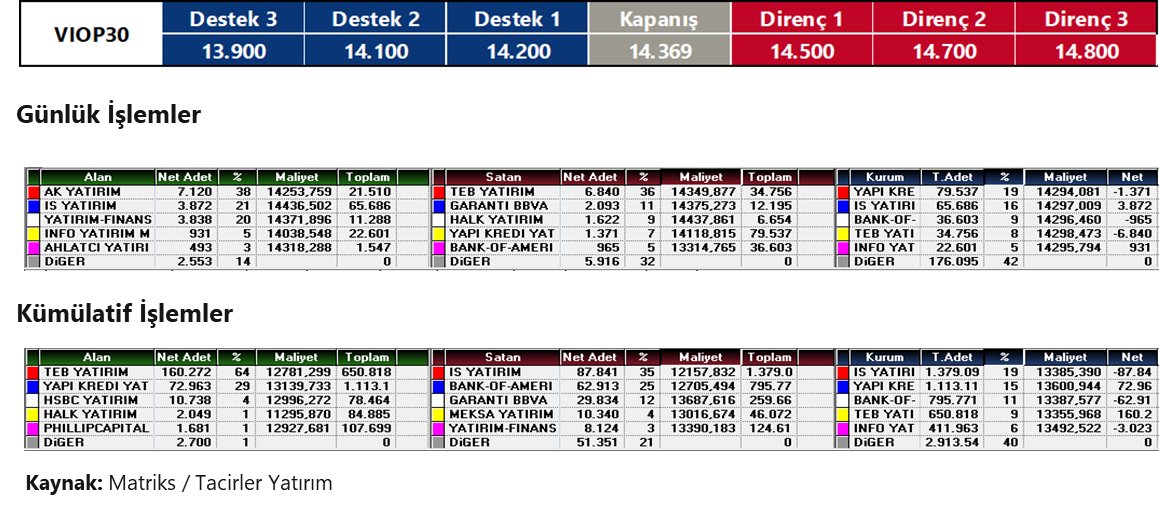 Şubat ayı VIOP 30 endeks kontratı, geçtiğimiz işlem gününde 14.369 puan seviyesinden günlük kapanış gerçekleştirdi. Bugün yukarı yönlü hareketlerde ilk olarak 14.500 ve ardından 14.700 puan seviyelerini takip edeceğiz. Aşağı yönlü olası hareketlerde 14.200 puan seviyesi ilk destek noktamızı oluştururken, ana desteğimiz 14.100 puan seviyesi.