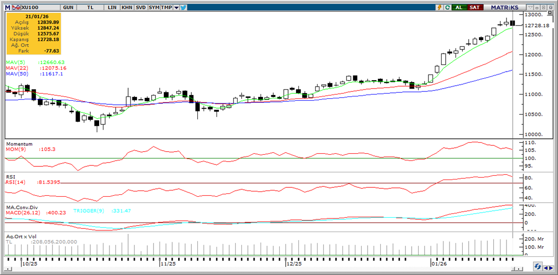 Günaydın. ABD Başkanı Trump’ın, Grönland’ın ABD’ye devri konusundaki ısrarına karşın, i) askeri seçenekleri gündem dışı tutması, ii) barışçıl yollarla ilerlemeyi tercih ettiğini söylemesi ve iii) geçtiğimiz hafta bazı Avrupa ülkelerine yönelik açıkladığı ek gümrük vergilerinden geri adım atması küresel piyasalara moral kazandırıyor. ABD borsaları dün %1+ yükselirken ABD ve Avrupa vadelileri ile Asya borsaları da bu sabah genel olarak pozitif bölgede. Borsa İstanbul’da ise dün ASELS’ın taban olması ile %0,6 düşüş gerçekleşti, ancak ASELS hariç bakıldığında endeksin %0,4 yükseldiğini hesaplıyoruz. Özellikle bankalar para girişi ve güçlü görünümleri ile öne çıkarken dün BIST 100 endeksindeki sekiz bankanın tamamı ortalama %2 yükseliş kaydetti. Endeks genelinde para girişi ve yüksek hacimler de devam ediyor. KLRHO, AKBNK, ISCTR, THYAO, YKBNK dün endekse en çok katkı sağlarken, ASELS, TUPRS, BIMAS, ASTOR, BRSAN endekse negatif etki etti. Son bir haftada düzenli para girişi ile dikkat çeken şirketler ise YKBNK, AKBNK, THYAO, CWENE ve VAKBN. Teknik açıdan 12.840, 12.900 ve 13.000 dirençleri ile 12.600 ve 12.520 destekleri izlenebilir. Günün ajandasında içeride PPK faiz kararı, rezervler ve yabancı işlemleri izlenecek. PPK’dan 150 baz puan faiz indirimi bekliyoruz. ABD’de ise bugün büyüme ve enflasyon verileri izlenecek. Türkiye 5 yıl vadeli CDS primleri güne 215 baz puandan başlıyor.