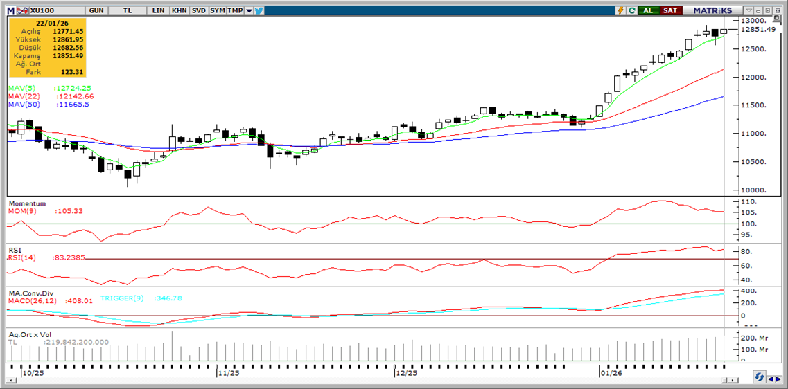 Günaydın. ABD ile Avrupa arasındaki Grönland anlaşmazlığının NATO ittifakı içinde çözülmesi küresel risk iştahının yeniden canlanmasına neden oluyor. ABD vadelileri bu sabah belirgin şekilde pozitif, Asya alıcılı, Avrupa vadelileri ise hafif negatif tarafta. Borsa İstanbul’da güçlü görünüm devam ediyor. 12.800 / 13.000 bölgesinde beklediğimiz soluklanma yaşansa da momentum halen pozitif, para girişi, yabancı alımları ve yüksek hacimler devam ediyor. PPK’dan 150 baz puan beklentilerine karşın 100 baz puanlık bir faiz indirimi gelmesi dün gün içinde sınırlı bir geri çekilme yaratsa da devamında gelen alımlarla BIST 100 Endeksi günü %0,97 yükselişle 12.851 seviyesinden kapatabildi. Endekse en fazla pozitif katkı sağlayan ilk beş şirket TCELL, BIMAS, TUPRS, EREGL, ASTOR; endekse negatif etki edenler ise AKBNK, KLRHO, ASELS, YKBNK, ISCTR oldu. Son bir haftada düzenli para girişi ile dikkat çeken şirketler ise YKBNK, EREGL, GARAN, GUBRF, TUPRS ve TAVHL. Teknik açıdan 12.800 / 13.000 halen geçerli bir direnç alanıdır, 12.915 seviyesi bu bant içinde ara direnç olarak izlenebilir; destekler ise 12.700 ve 12.570. Günün makro veri takviminde Avrupa ve ABD PMI verileri izlenecek. Akşam saatlerinde ise Moody’s (Ba3, durağan) ve Fitch’in (BB-, durağan) Türkiye’nin kredi notuna dair değerlendirmeleri bekleniyor. Bugün, not değişikliği beklemiyoruz, ancak her iki kuruluşun da kredi notu görünümlerini “pozitif”e yükseltmesini bekliyoruz. Son olarak, Türkiye 5 yıl vadeli CDS primleri güne 211 baz puandan başlıyor. Jeopolitik tansiyonun dinmesi ile CDS’lerde yeniden gevşeme gördüğümüzü belirtelim.