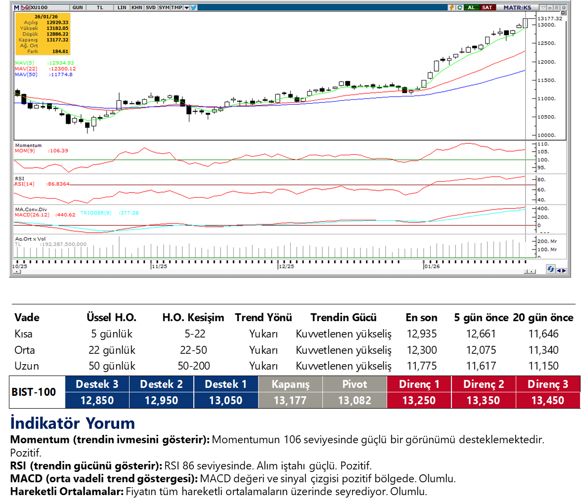 Günaydın. Küresel risk iştahı, haftaya zayıf bir başlangıç yapılmasına karşın dün gün içinde toparlandı ve bu sabah da pozitif kalmayı sürdürüyor. ABD ve Avrupa vadelileri ile Asya borsaları bu sabah alıcılı. Borsa İstanbul’da ise rekor serisi devam ediyor. Dün %1,42 yükselişle günü TL bazında yeni bir zirveden (13.177) kapatan BIST 100 endeksi, dolar bazında da son bir buçuk yılın zirve seviyesine (304 dolar) geldi ve buradan 314 dolara kadar grafikte bir boşluk olduğunu görüyoruz. Bu boşluk, Ağustos 2024’te Japon Yeni’ne bağlı carry trade pozisyonlarında çözülme korkuları ile küresel piyasalarda oluşan panik döneminde yaşanmıştı ve halen doldurulamadı. Mevcut kurlarla baktığımızda endeksin dolar bazlı grafiklerdeki bu boşluğu kapatması için 13.600 / 13.700 bölgesine tırmanması gerekiyor. 13.350/400 bölgesi ara direnç olarak izlenebilir. 12.900 ve 12.700 ise destek konumunda. Endekse dün pozitif katkı sağlayan ilk beş şirket ASELS, TRALT, AKBNK, TCELL, SASA; endekse negatif etki edenler ise KLRHO, YKBNK, THYAO, TURSG, GENIL oldu. Son bir haftada düzenli para girişi ile dikkat çeken şirketler ise AKBNK, EREGL, ISCTR, SASA ve GARAN. Günün ajandası görece sakin, ABD’de konut fiyatları ve büyüme odaklı orta önem derecesinde bazı veriler izlenecek. Piyasaların takip edeceği asıl başlık ise yarın akşam sonuçlanacak olan Fed toplantısı olacaktır. Son olarak, Türkiye 5 yıl vadeli CDS primleri güne 212 baz puandan başlıyor.