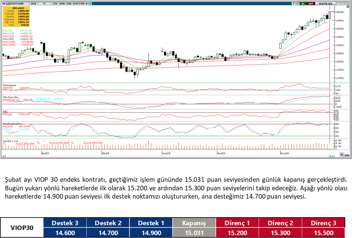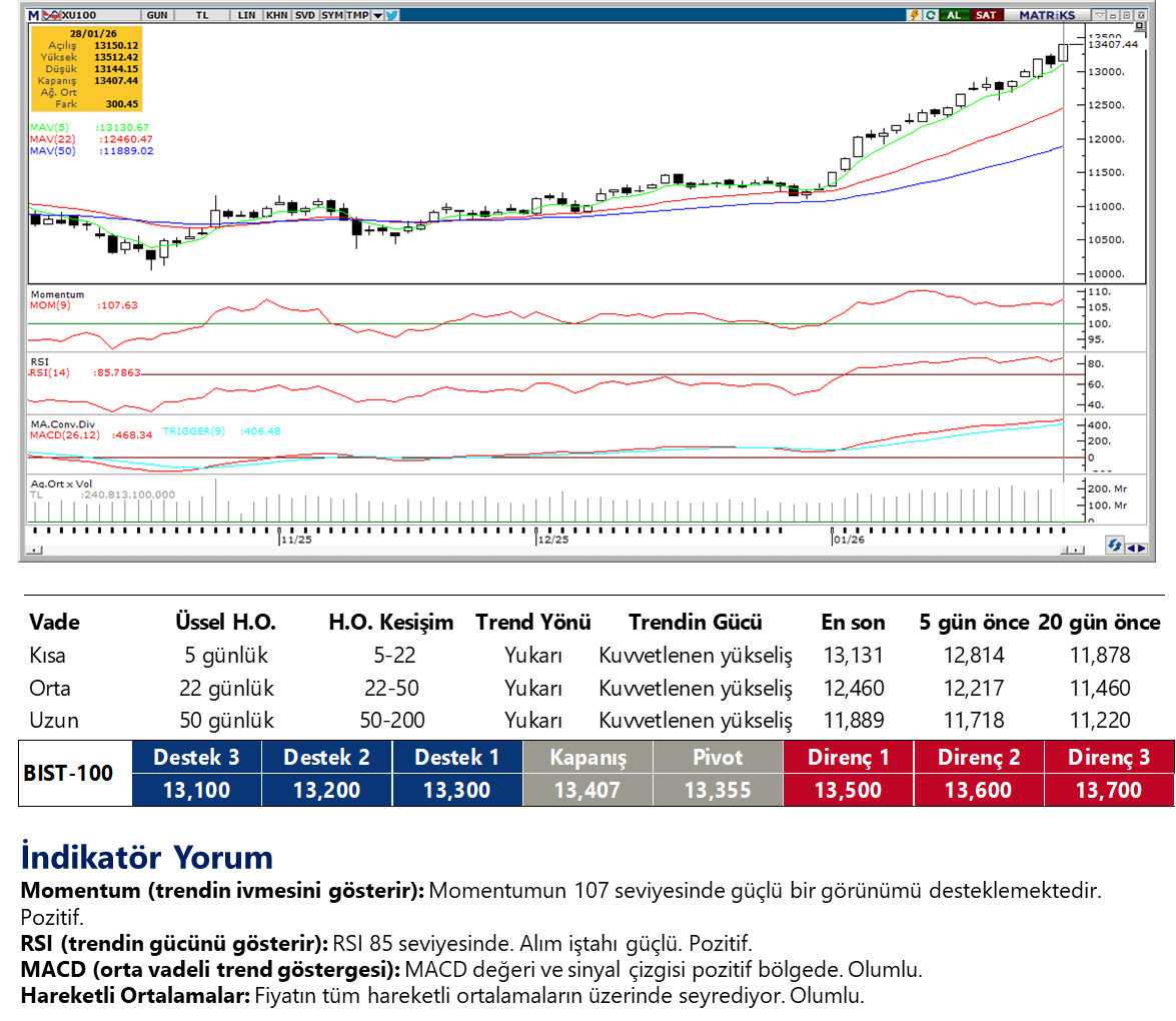 Günaydın. Fed, beklendiği gibi politika faiz bandını %3,50 - %3,75 aralığında bıraktı. Açıklamalarda, istihdamdaki zayıflığın dengelendiği, büyümenin devam ettiği, enflasyonda katılığın sürdüğü paylaşıldı. Piyasa tahminlerine paralel olan karar ve açıklamalar nedeniyle borsalarda da anlamlı bir tepki olmadığını söyleyebiliriz. Son dönemin en hareketli piyasası kıymetli madenler tarafında ise ralli devam ediyor. ABD ve İsrail’in, 2025 Haziran ayında olduğu gibi yeniden İran’a yönelik müdahale hazırlığında olduğuna işaret eden askeri hareketlilik jeopolitik risk fiyatlamasını canlı tutuyor ve kıymetli madenler ile petrol fiyatları başta olmak üzere bazı endüstriyel metallerde de sert yükselişler görüyoruz. Bu varlıklardaki fiyat hareketlerinin sadece jeopolitik meselelerle ilgili olmadığını, son gelişmelerin sadece bir katalist olarak fiyatlamayı hızlandırdığını da belirtelim. İçeride de güçlü piyasa devam ediyor. BIST 100 endeksi dün %2,3 yükselirken 13.512 ile gün içi, 13.407 ile de kapanış rekorunu tazeledi. Dün endekse en fazla pozitif katkı sağlayan ilk beş şirket KLRHO, AKBNK, TUPRS, SAHOL, BIMAS; endekse negatif etki edenler ise PASEU, ASELS, HALKB, MAGEN, EFOR oldu. Son bir haftada düzenli para girişi ile dikkat çeken şirketler ise AKBNK, GARAN, ISCTR, TUPRS, YKBNK, SASA, SAHOL, AEFES, EKGYO ve EREGL. Teknik açıdan 13.600/800 bölgeleri direnç, 12.900/13.000 bölgesi destek olarak izlenebilir, 13.300 ara destek konumunda. Günün ajandasında içeride işsizlik oranı, ekonomik güven endeksi ve TCMB rezervleri ile yabancı işlemleri izlenecek. ABD’de ise istihdam, tüketim ve endüstriyel üretime yönelik veriler açıklanacak. Türkiye 5 yıl vadeli CDS primleri güne 216 baz puandan başlıyor.