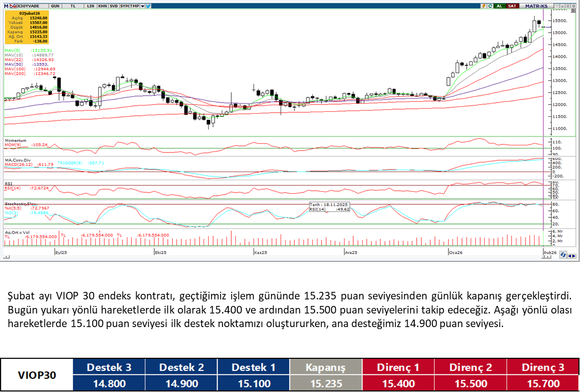 USD/TRY paritesi orta vadede yukarı yönlü ana trendini koruyor. Olası geri çekilmelerde 42,50 seviyesi, teknik görünümün bozulmaması açısından kritik bir denge noktası olarak öne çıkıyor. Bu seviye üzerinde kalındığı sürece ana eğilimin korunması ve yükseliş yönlü beklentilerin geçerliliğini sürdürmesi bekleniyor. 42,50’nin aşağı yönlü kırılması hâlinde ise 42,40 ve 42,34 seviyeleri bir sonraki destek alanları olarak izlenecek.