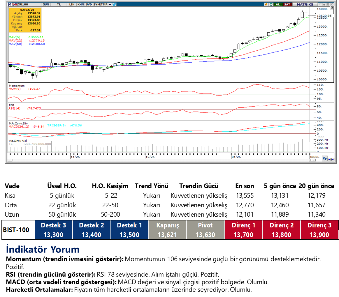 Günaydın. Kıymetli madenlerdeki sert düşüşler sonrasında son 24 saatte toparlanma ve tepki arayışı yaşanırken küresel borsalarda da moralli bir seyir takip ediyoruz. Dün, güne satışla başlayan ABD ve Avrupa borsaları günü pozitif tarafta kapatırken, bu sabah vadeli endeks kontratlarında da alımlar devam ediyor. Benzer şekilde, Asya’da da genel görünüm pozitif ve %5’lere varan yükselişler dikkat çekiyor. Yılbaşından bu yana %21 yükselen Borsa İstanbul’da ise dün günlük bazda %1,6 kayıp yaşandı, ancak gün içi dip seviyelerden bir ara %3,4’e yakın tepki verildiğini, para çıkışının önceki günlerdeki yüksek girişler dikkate alındığında sınırlı kaldığını belirtelim. Dün endekse en fazla pozitif katkı sağlayan ilk beş şirket DSTKF, ISCTR, THYAO, CCOLA, AEFES; endekse negatif etki edenler ise TUPRS, KLRHO, AKBNK, TRALT, ASELS oldu. Son bir haftada düzenli para girişi ile dikkat çeken şirketler ise PGSUS, KCHOL, AKFYE, AEFES ve SASA. Teknik açıdan 13.900 / 14.000 bölgesi direnç, 13.400 ve 13.000/13.300 bandı destek olarak izlenebilir. Günün ajandasında içeride Ocak ayı TÜFE verileri öne çıkıyor. Gıda fiyatlarındaki artış ile beraber aylık bazda %4,13 gibi yüksek bir rakam bekliyoruz ve bununla beraber yıllık TÜFE’nin %30,9’dan %29,8’e gerileyeceğini düşünüyoruz. Devam eden süreçte ise, yıllık TÜFE’nin ilk çeyrek sonunda %28,9’a, yıl ortasında %27’ye, sene sonunda ise %23 seviyesine gerilemesini bekliyoruz. Buna paralel olarak PPK’dan faiz indirimlerinin de devam edeceğini düşünüyoruz. Dışarıda ise görece sakin bir veri takvimi var. Son olarak, Türkiye 5 yıl vadeli CDS primleri güne 216 baz puandan başlıyor.