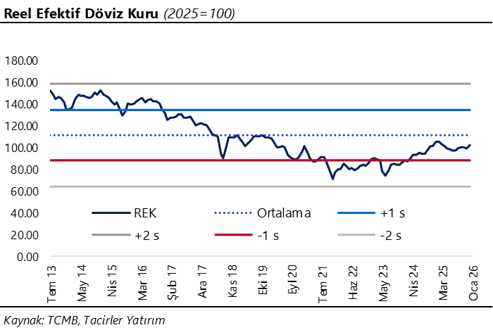 Reel efektif döviz kuru (REK), ocak ayında tahminlerimize paralel bir artış göstererek 99 seviyesinden 102,2’ye çıktı ve TL’de %3,4’lük bir reel değer kazancına işaret etti. Bu artışta, TÜFE’deki yükselişin nominal kur artışını aşması belirleyici oldu. Böylece Türk lirası, eşit ağırlıklandırılmış döviz sepeti karşısında iki ay üst üste reel bazda değer kaybettikten sonra ocak ayında yeniden reel değer kazandı.