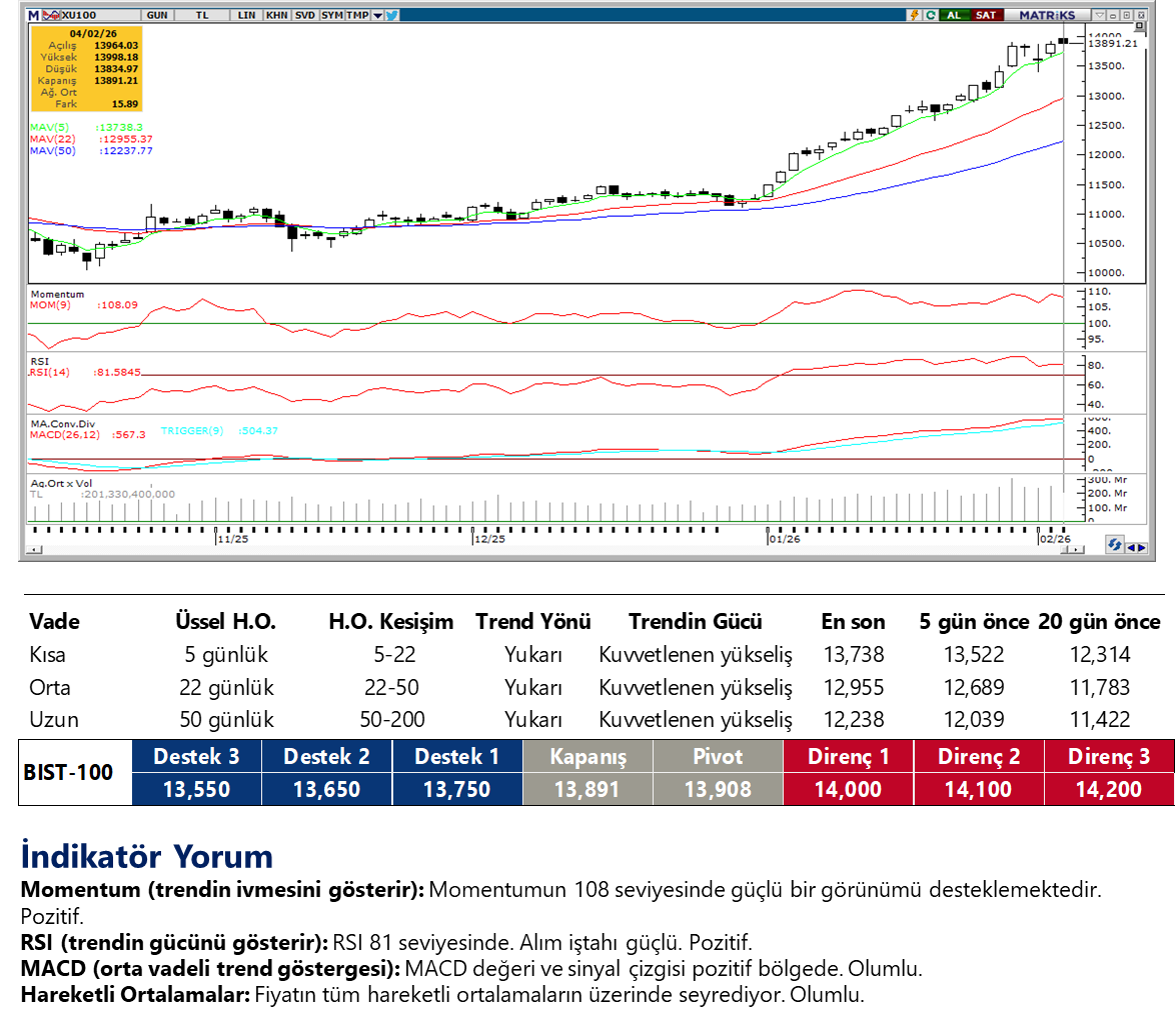 Borsa İstanbul’da, dün 13.900 / 14.000 direnç bölgesi bir kez daha test edilirken beşinci gününde de aşılamadı ve endeks günü sadece %0.11 artışla 13891.21 puandan tamamladı. Dün endekse en fazla pozitif katkı sağlayan ilk beş şirket KLRHO, ASELS, BIMAS, ASTOR, DSTKF; endekse negatif etki edenler ise AKBNK, YKBNK, TUPRS, ISCTR, SAHOL oldu. Son bir haftada düzenli para girişi ile dikkat çeken şirketler ise MGROS, VAKBN, GUBRF, SASA, FROTO, ARCLK, TTKOM, TAVHL ve ALARK. Teknik açıdan, 13.900 / 14.000 bandı ilk direnç alanı olarak kalmayı sürdürüyor. Destekler ise sırasıyla 13.830, 13.580 ve 13.390.