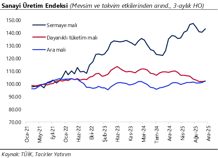 Mevsim ve takvim etkilerinden arındırılmış sanayi üretimi aralık ayında aylık bazda %1,2 artarken, takvim etkisinden arındırılmış yıllık değişim %2,1 daralmaya işaret etti. Kasım ayında aylık artışın %2,5, yıllık artışın ise %2,2 olduğu dikkate alındığında, sanayi aktivitesinde aralık ayında belirgin bir ivme kaybı izlendiği görülüyor. Alt kalemlere bakıldığında, yıllık daralmada yüksek teknoloji ürünleri (%-25) başta olmak üzere giyim eşyaları imalatı (%-29,2), metal cevheri madenciliği (%-23,4) ve savunma sanayi ürünlerini de içeren diğer ulaşım araçları imalatı (%-9,2) öne çıktı. Özellikle yüksek teknoloji ve diğer ulaşım araçlarında görülen yıllık daralma, bu kalemlerde aylar sonra ilk kez negatif bölgeye geçildiğine işaret ediyor. Aralık verileri ile birlikte sanayi üretimi, 2025 yılının son çeyreğinde yıllık bazda %0,8 büyüme kaydederken (takvim etkisinden arındırılmış yıllık büyüme %0,6), çeyreklik büyüme ise bu dönemde %0,1 ile yataya yakın bir görünüm sergiledi. Hatırlanacağı üzere üçüncü çeyrekte sanayi üretimi yıllık bazda %5,2 büyürken (takvim etkisinden arındırılmış yıllık büyüme %5), çeyreklik bazda %0,6 daralmıştı. Bu çerçevede, sanayi üretimi verileri yılın son çeyreğinde çeyreklik bazda zayıf bir toparlanmaya, yıllık bazda ise belirgin bir ivme kaybına ve sanayi aktivitesinde yavaşlamaya işaret ediyor. Öncü göstergeler ve yakından takip ettiğimiz yüksek frekanslı verilerden yola çıkarak, 2025 yılının son çeyreğinde büyümenin %3,6 civarında gerçekleşmesini bekliyoruz. 2025 yılı geneli için %3,8, 2026 yılı için ise %4 büyüme öngörüyoruz.