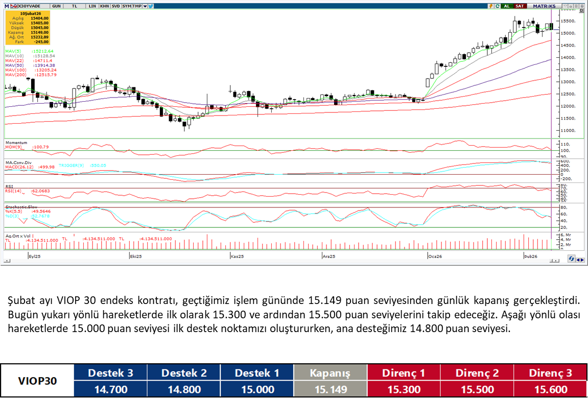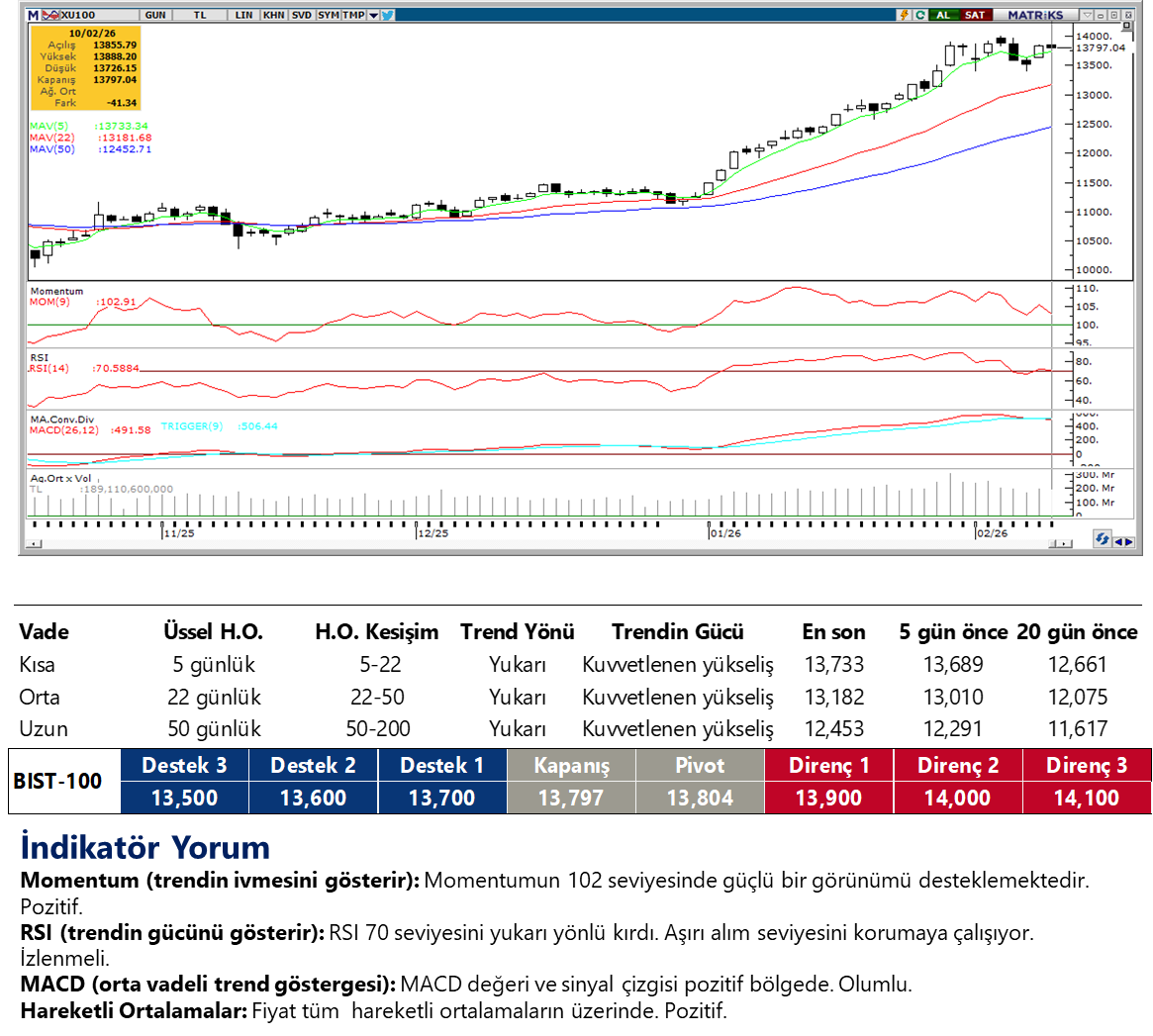 Günaydın. ABD ve Avrupa borsalarında dün zayıf bir seyir yaşanmasına karşın vadeli endeks kontratları bu sabah tepki arıyor. Asya’da ise Tokyo Borsası bugün kapalı, geri kalan bölge borsaları alıcılı. Küresel çapta bakıldığında, gelişmiş ülke borsalarının son bir yılda çok güçlü bir performans sergilemelerine karşın sene başından bu yana ivme kaybettiklerini, gelişmekte olan ülke borsalarının ise görece pozitif bölgede kalmaya devam ettiklerini görüyoruz. Ortalamalara bakarsak, BIST 100 endeksi sene başından bu yana dolar bazında %21 getiri sağlarken MSCI Gelişmekte Olan Ülkeler Endeksi %10, önemli bölümünü ABD borsalarının oluşturduğu MSCI Dünya Endeksi ise %3 yükseliş sergiledi. 2026 Görünüm Raporu’muzda da dikkat çektiğimiz gibi, Borsa İstanbul’un küresel borsalara görece güçlü kaldığını görüyor ve yıl genelinde de bu durumun devam edeceğini düşünüyoruz. Düne bakarsak, %0,3 gerileme ile 13797 puana gerileyen BIST 100 endeksine en fazla pozitif katkı sağlayan ilk beş şirket ASELS, TRALT, THYAO, KTLEV, ASTOR; endekse negatif etki edenler ise AKBNK, TUPRS, PASEU, EREGL, KCHOL oldu. Son bir haftada düzenli para girişi ile dikkat çeken şirketler ise THYAO, FROTO, TURSG, BIMAS, HALKB, BRSAN ve GUBRF. Teknik açıdan 13.900 / 14.000 bölgesi önemli direnç alanı; 13.400 ara destek, 13.000 / 13.300 bölgesi ise önemli destek alanı. Günün ajandasında beş gün gecikme ile açıklanacak olan ABD istihdam verileri öne çıkıyor. Ek olarak, ABD – İran müzakereleri başta olmak üzere jeopolitik meseleler yatırımcıların takibinde kalmayı sürdürüyor. Türkiye 5 yıl vadeli CDS primleri güne 213 baz puandan başlıyor.