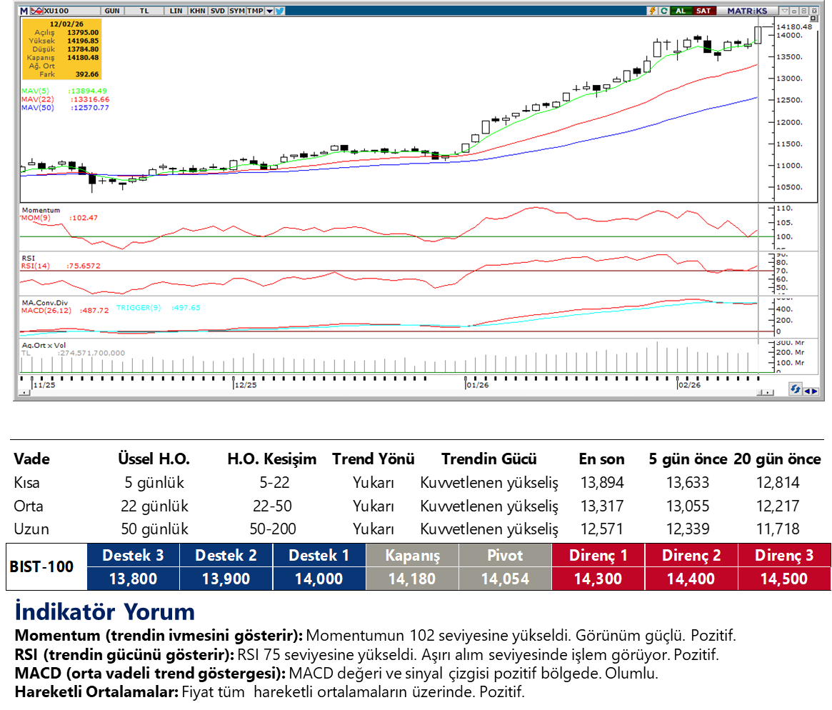 Günaydın. ABD borsalarında dün teknoloji hisseleri öncülüğünde %2’lere varan satışlar vardı, fakat bu sabah ABD vadelileri dengeli. Avrupa'da ise dün daha sınırlı bir zayıflık ardından bu sabah vadeli endeks kontratları daha belirgin şekilde alıcılı hareket ediyor. Asya'da ise genel görünüm negatif. Küresel tarafta yaşanan bu zayıf piyasa görünümüne karşın, Borsa İstanbul'da dün oldukça güçlü bir seyir izledik. TCMB’nin yıl sonu için enflasyon tahmin bandını %13-19’dan %15-21’e 200 baz puan yukarı revize etmesine karşın piyasa beklentilerinin halen altında tutması ve faiz indirimleri konusunda tempo artırmadan da olsa indirimlerin devam edebileceği mesajları destekleyici oldu. Ek olarak, Rusya'nın ABD ile bir ekonomik işbirliği ve dolar sistemine geri dönüş arayışında olduğuna dair haber akışı da gün içinde pozitif yönde fiyatlandı. BIST 100 Endeksi, dün %2,9 artışla 14.180 puana yükselirken, endekse en fazla pozitif katkı sağlayan ilk beş şirket AKBNK, YKBNK, ASELS, ISCTR, KCHOL; endekse negatif etki edenler ise KLRHO, PASEU, MAGEN, CWENE, IZENR oldu. Son bir haftada düzenli para girişi ile dikkat çeken şirketler ise AKBNK, YKBNK, FROTO ve AEFES. Dün, Borsa İstanbul tarihinin en yüksek yabancı alımlarından ve günlük para girişlerinden biri yaşandı ve bu momentumun kısa sürede tersine döneceğini düşünüyoruz. Teknik açıdan 14.000 üzerinde 14.200, 14.500 ve 14.800 / 15.000 bölgeleri direnç ve sıralı hedefler olarak izlenebilir. 13.900, 13.700 ve 13.400 ise destek konumunda. Günün ajandasında içeride cari denge ve TCMB Piyasa Katılımcıları Anketi, Avrupa’da büyüme, ABD’de TÜFE verileri izlenecek. Türkiye 5 yıl vadeli CDS primleri güne 213 baz puandan başlıyor.