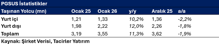 PGSUS: Şirket, ocak ayı yolcu istatistiklerini açıkladı. Buna göre, ocak ayı toplam yolcu sayısı geçen yılın aynı ayına göre %13,3 artış, bir önceki aya göre %1,9 azalışla 3,55 milyon kişi oldu. Yolcu doluluk oranı ise yıllık 1.8 puan artışla %87,1 olarak gerçekleşti.