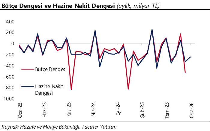 Hazine nakit dengesi ocakta 246,2 milyar TL açık verirken, faiz dışı denge ise 207,5 milyar TL fazla kaydetti. Ocak ayı Hazine nakit dengesi verileri, 16 Şubat Pazartesi günü açıklanacak olan merkezi yönetim bütçe verileri için öncü niteliğinde. Bu çerçevede, merkezi yönetim bütçe dengesinin ocak ayında 165 milyar TL civarında açık verebileceğini tahmin ediyoruz. 2026 bütçe açığı tahminimiz 2,8 trilyon TL (GSYİH’nın %3,4’ü) seviyesinde bulunmakla birlikte, tahminimize yönelik risklerin aşağı yönlü olduğunu değerlendiriyoruz. Mevcut görünüm, mali duruşta yapısal bir sıkılaşmadan ziyade, harcama kompozisyonundaki geçici iyileşmelerin belirleyici olduğuna işaret ediyor. Bununla birlikte, cari harcamalar ile sermaye harcamalarının seyri, mali disiplinin kalıcılığı açısından önümüzdeki dönemde temel risk alanları olmayı sürdürüyor.