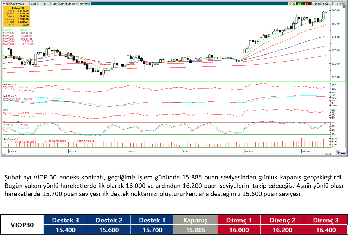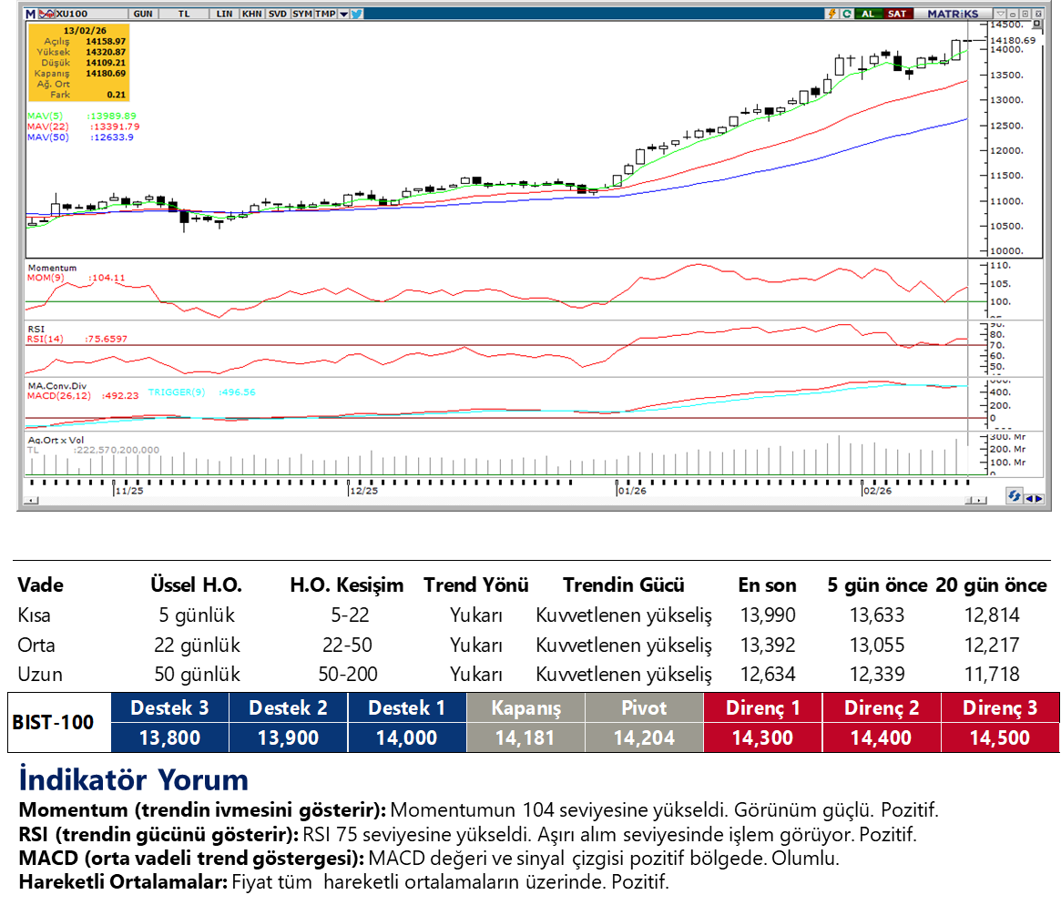 Günaydın. Yeni haftaya başlarken küresel risk iştahı dengeli, bugün ABD borsaları ve bazı Asya piyasaları kapalı olacak. Fakat açık piyasalar ve vadeli işlemler genel olarak yatay bir görünüm sergiliyor. Borsa İstanbul'da da Cuma günü başladığımız seviyeden günü tamamladık. BIST 100 endeksi gün içinde 14.320 seviyesine kadar tırmanmış olmasına rağmen günü 14.180’le bir gün önceki kapanış seviyesiyle aynı noktadan tamamladı. Endekse pozitif katkı sağlayan ilk beş şirket THYAO, BIMAS, SAHOL, KCHOL, TCELL; endekse negatif etki edenler ise KLRHO, AKBNK, YKBNK, ISCTR, TUPRS oldu. Son bir haftada düzenli para girişi ile dikkat çeken şirketler ise THYAO, ASTOR, TCELL, EKGYO, FROTO, CCOLA ve AEFES. Teknik seviyelere bakarsak 14.320, 14.500 ve 14.800 / 15.000 bandı direnç, 14.000, 13.650 ve 13.400 destek olarak izlenebilir. 12 aylık değerlemelerin işaret ettiği uzun vadeli BIST 100 endeks hedefi ise 17 bin civarında kalmaya devam ediyor. 4Ç25 finansallarının henüz %10’u bile açıklanmadı, fakat ilk rakamlara göre genel olarak beklenti üzeri karlılıklar ve yıllık bazda büyüme sergileyen şirket sayısında artış görüyoruz. Bu nedenle, uzun vadeli endeks hedeflerinde yukarı revizyonlar devam edebilir. Günün ajandasında içeride Hazine ihaleleri, Avrupa’da sanayi üretimi izlenecek. Türkiye 5 yıl vadeli CDS primleri güne 215 baz puandan başlıyor.