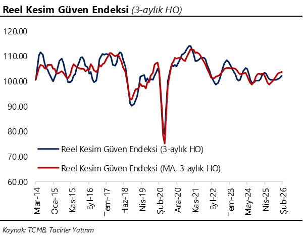 Arındırılmamış reel kesim güven endeksi (RKGE) şubat ayında bir önceki aya göre 2,5 puan artarak 104,1 seviyesine, mevsim etkilerinden arındırılmış RKGE ise 1,1 puan yükselerek 104,1’e çıktı. 100 eşik değerin üzerinde kalmakta olan RKGE, anketin kapsadığı reel kesim temsilcilerinin ekonomik faaliyetlere ilişkin güveninin arttığı iyimser görünüme işaret ediyor. Endeksi oluşturan anket sorularına ait yayılma endeksleri incelendiğinde; şubat ayında son üç aydaki toplam sipariş miktarı, gelecek üç aydaki üretim hacmi, mevcut toplam sipariş miktarı, gelecek üç aydaki ihracat sipariş miktarı, sabit sermaye yatırım harcaması ve mevcut mamul mal stokuna ilişkin değerlendirmeler endeksi artış yönünde etkilerken, gelecek üç aydaki toplam istihdam ve genel gidişata ilişkin değerlendirmeler endeksi azalış yönünde etkiledi. Kapasite Kullanım Oranı (KKO) ise şubat ayında %74,1’den %73,5’e, mevsimsel etkilerden arındırılmış KKO ise %74,4 seviyesinden %74’e geriledi. Bu çerçevede, RKGE’deki artış reel kesimin kısa vadeli üretim ve sipariş beklentilerinde toparlanma eğiliminin sürdüğüne işaret ederken, kapasite kullanım oranındaki gerileme mevcut üretim temposunun henüz belirgin bir ivme kazanmadığını gösteriyor. Özellikle istihdam ve genel gidişata ilişkin beklentilerdeki zayıflama, güven artışının temkinli bir iyimserlik içerdiğini düşündürüyor. Bununla birlikte, yüksek faiz ortamına rağmen iç talebin dirençli seyrettiği ve büyümenin %3,5 – %4 bandında kalmaya devam ettiği bir konjonktürde, sipariş ve yatırım kalemlerindeki güçlenmeyi anlamlı buluyoruz. Kapasite kullanımındaki sınırlı gerilemenin ise talep zayıflığından ziyade temkinli üretim planlamasına işaret ettiğini değerlendiriyoruz. Kurum olarak büyümenin 2025 yılında %3,8 seviyesinde gerçekleşmesini, 2026 yılında ise %4’e yükselmesini bekliyoruz. 2026 büyüme tahminimize ilişkin risklerin yukarı yönlü olduğunu değerlendiriyoruz.