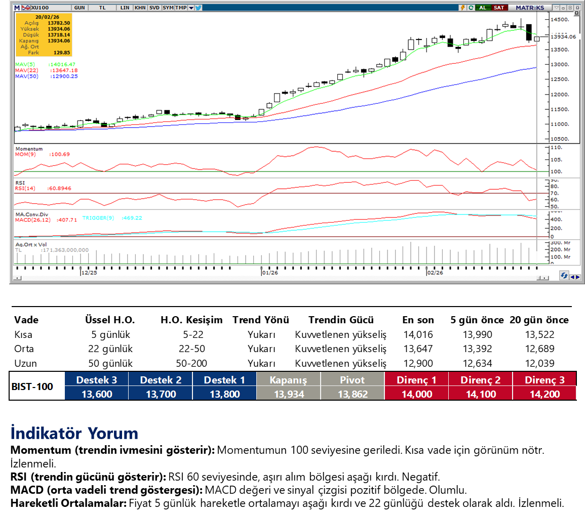 Günaydın. ABD’de, Trump yönetimi tarafından uygulanan küresel gümrük vergilerinin yüksek mahkeme tarafından iptal edilmesi piyasalara moral verse de; kararın ardından Trump’ın önce %10, ardından %15 ithalat vergisi uygulanacağını açıklaması yeniden satış getiriyor. ABD – İran gerginliğinin bürokratik görüşme trafiği devam etmesine karşın halen tırmanma safhasında olması da satışlarda etkili. ABD ve Avrupa vadelileri bu sabah belirgin oranlarda negatif, açık Asya borsalarında ise daha dengeli bir görünüm var. Borsa İstanbul’da, Perşembe günü %3’ü aşan düşüşün ardından Cuma günü %0,94 artışla 13.934 puana tepki verildi ve BIST 100 endeksi günün en yüksek seviyesinden kapandı. 14 bin civarına tepki arayışı devam edebilir, ancak küresel borsalardaki zayıflığın ve yakın coğrafyamızda artan jeopolitik tansiyonun bir süreliğine BIST için de sınırlayıcı olacağını düşünüyoruz. Cuma günü endekse en fazla pozitif katkı sağlayan ilk beş şirket DSTKF, ASELS, THYAO, AKBNK, YKBNK olurken, endekse negatif etki edenler ise KLRHO, BIMAS, SASA, EKGYO, CCOLA oldu. Son bir haftada düzenli para girişi ile dikkat çeken şirketler ise YKBNK, TRALT, EREGL, PASEU ve AKSA. Teknik açıdan 14.000 / 14.100 bandı ilk direnç, 13.700 / 13.800 bandı ise ilk destek alanı olarak takip edilebilir. Günün makro veri ajandasında ABD’de fabrika siparişleri ve dayanıklı mal siparişleri öne çıkıyor. Haftanın devamında jeopolitik meseleler dışında Avrupa ve ABD’de enflasyon verileri ile Fed yöneticilerinin açıklamaları, içeride ise dış ticaret dengesi, ekonomik güven endeksi ve TCMB verileri takip edilecek. Türkiye 5 yıl vadeli CDS primleri güne 222 baz puandan başlıyor.