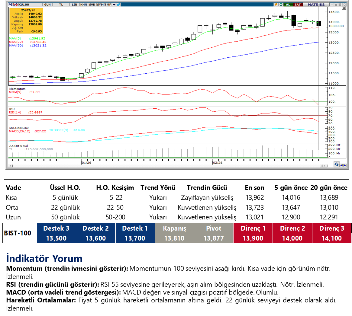 Günaydın. Küresel borsalarda dün yaşanan pozitif seyrin ardından, ABD ve Avrupa vadelileri bu sabah hafif negatif; Asya’da ise Çin ve Hong Kong zayıf, geri kalan bölge borsaları alıcılı. Avrupa borsalarında, özellikle Fransa ve İngiltere’de dün rekorlar tazelendi, ancak Nvidia’nın beklentileri aşan ve dolar bazında yıllık %70’lere varan güçlü büyümelere işaret eden finansallarına karşın batı borsalarında risk iştahı sınırlı. Borsa İstanbul’da ise, Morgan Stanley’nin “düzeltme” riskine dikkat çekmesi ve MSCI’in Kiler Holding’e dair endeks güncelleme kararını geri çekmesi dün açılışta satış getirdi, sonrasında gün boyu yatay bir seyir ve 13.800 civarında denge arayışı gördük. BIST 100 Endeksi, dünü %1,7 azalışla 13.810 puandan tamamlarken, endekse en fazla pozitif katkı sağlayan ilk beş şirket KUYAS, MAGEN, YKBNK, TAVHL, MAVI; endekse negatif etki edenler ise KLRHO, DSTKF, TUPRS, ASELS, KCHOL oldu. Son bir haftada düzenli para girişi ile dikkat çeken şirketler ise YKBNK, AKBNK, ASTOR, EREGL, ISCTR, MGROS, SISE ve FROTO. Fiyat bazında gerileme görülmesine karşın net alıcı – satıcı dengesi alıcı lehine ve para girişine işaret eden ASTOR gibi şirketlerin sayısındaki artış, geri çekilmelerin biriktirme amaçlı kullanıldığına işaret ediyor. Teknik açıdan 13.700 ve 13.400 destekleri ile 14.100 / 14.200 ve 14.450 / 14.550 dirençleri izlenebilir. Günün ajandasında ABD – İran müzakereleri ana başlık. Veriler tarafında içeride dış ticaret dengesi, ekonomik güven endeksi, rezervler ve haftalık yabancı işlemleri izlenecek. Avrupa’da yine güven endeksleri, ABD’de ise istihdam odaklı haftalık veriler takip edilecek. Türkiye 5 yıl vadeli CDS primleri güne 224 baz puandan başlıyor.