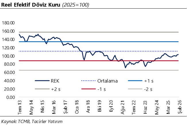 Reel efektif döviz kuru (REK), şubat ayında tahminlerimize paralel bir artış göstererek 102,15 seviyesinden 103,2’ye çıktı ve TL’de %1 oranında bir reel değer kazancına işaret etti. Bu artışta, TÜFE’deki yükselişin nominal kur artışını aşması belirleyici oldu. Böylece Türk lirası, eşit ağırlıklandırılmış döviz sepeti karşısında üst üste ikinci ayında da reel bazda değer kazanırken, yılın ilk iki ayında TL’de kaydedilen kümülatif reel değer artışı %4,2 oldu.