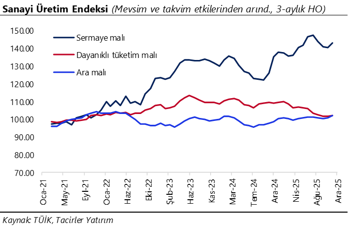 Mevsim ve takvim etkilerinden arındırılmış sanayi üretimi aralık ayında aylık bazda %1,2 artarken, takvim etkisinden arındırılmış yıllık değişim %2,1 daralmaya işaret etti. Kasım ayında aylık artışın %2,5, yıllık artışın ise %2,2 olduğu dikkate alındığında, sanayi aktivitesinde aralık ayında belirgin bir ivme kaybı izlendiği görülüyor. Alt kalemlere bakıldığında, yıllık daralmada yüksek teknoloji ürünleri (%-25) başta olmak üzere giyim eşyaları imalatı (%-29,2), metal cevheri madenciliği (%-23,4) ve savunma sanayi ürünlerini de içeren diğer ulaşım araçları imalatı (%-9,2) öne çıktı. Özellikle yüksek teknoloji ve diğer ulaşım araçlarında görülen yıllık daralma, bu kalemlerde aylar sonra ilk kez negatif bölgeye geçildiğine işaret ediyor. Aralık verileri ile birlikte sanayi üretimi, 2025 yılının son çeyreğinde yıllık bazda %0,8 büyüme kaydederken (takvim etkisinden arındırılmış yıllık büyüme %0,6), çeyreklik büyüme ise bu dönemde %0,1 ile yataya yakın bir görünüm sergiledi. Hatırlanacağı üzere üçüncü çeyrekte sanayi üretimi yıllık bazda %5,2 büyürken (takvim etkisinden arındırılmış yıllık büyüme %5), çeyreklik bazda %0,6 daralmıştı. 2025 yılında kaydedilen %3,6’lık büyümenin ardından 2026 yılı için %4 büyüme öngörüyoruz.
