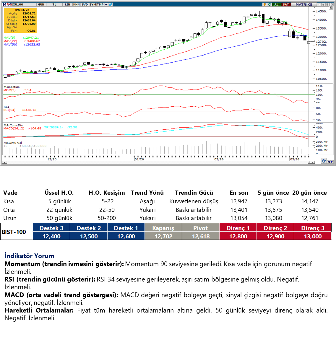 Günaydın, küresel risk iştahı jeopolitik gelişmelerin gölgesinde kırılgan seyrini korurken piyasalarda dünkü sert satışların ardından daha temkinli bir toparlanma çabası öne çıkıyor. ABD Başkanı Trump’ın İran ile savaşın beklenenden daha kısa sürebileceğine yönelik açıklamaları ve Hürmüz’den geçişlerin sürdüğüne dair mesajlar piyasada bir miktar rahatlama yarattı. Bu gelişmelerin ardından ABD borsaları gün içindeki sert satışların ardından toparlanarak günü yükselişle tamamladı. Dow Jones %0,5, S&P 500 %0,8 ve Nasdaq %1,4 yükselirken, teknoloji hisseleri hareketin öncüsü oldu. Avrupa borsaları ise enerji fiyatlarındaki yükseliş ve artan belirsizliğin etkisiyle günü negatif tarafta kapattı. Asya borsalarında bu sabah güçlü tepki alımları görülürken, ABD ve Avrupa vadelilerinde yataya yakın, sınırlı negatif bir seyir öne çıkıyor. Yurtiçine döndüğümüzde endekste gün içinde satış baskısı görülse de seansın son bölümünde gelen alımlarla kayıpların önemli kısmı telafi edildi ve BIST 100 endeksi günü %0,71 düşüşle 12.702 puandan tamamladı. ABD’de Halkbank davasına ilişkin uzlaşma haberleri hisse özelinde güçlü bir hareket yaratırken, endeksin seans sonuna doğru toparlanmasında da etkili oldu. Endekse dün en fazla pozitif katkı sağlayan şirketler BIMAS, THYAO, KTLEV ve HALKB olurken, negatif etki edenler ise ASELS, TUPRS ve KLRHO oldu. Teknik açıdan 12.700 ve 12.550 seviyeleri bugün için destek bölgeleri olarak izlenirken, yukarıda 12.900 ve 13.000 bandı ilk direnç alanı konumunda. Günün ajandasında içeride sanayi üretimi ve Hazine ihaleleri öne çıkarken küresel tarafta Almanya dış ticaret verileri ve ABD’de açıklanacak mevcut konut satışları verisi takip edilecek. Türkiye 5 yıl vadeli CDS primleri güne 268,5 baz puan seviyesinde başlıyor.