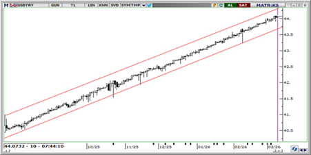 USD/TRY’de 44,07 seviyesi etrafındaki seyir korunurken, TCMB’nin sıkı likidite adımları kurdaki hareketi görece kontrollü tutmaya devam ediyor. Küresel tarafta savaş kaynaklı riskler canlı kalmakla birlikte, Trump’ın daha ılımlı mesajları sonrası petrol ve dolar tarafındaki baskının bir miktar hafiflediği görülüyor. Buna karşın jeopolitik belirsizlikler nedeniyle kurda yukarı yönlü eğilim korunuyor. 44,00 seviyesi kısa vadede kritik; 44,10 üzerinde 44,20 ve 44,35 direnç, aşağıda 44,00, 43,90 ve 43,80 destek olarak takip edilebilir.