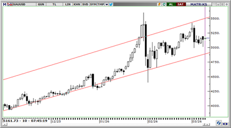Ons altın bu sabah 5.163$ seviyesine yükselirken, jeopolitik risklerin canlı kalması ve güvenli liman talebi fiyatları desteklemeye devam ediyor. Petrol fiyatlarındaki geri çekilme ve tahvil faizlerindeki sınırlı gevşeme de kısa vadeli toparlanmayı destekleyen unsurlar arasında yer alıyor. Teknik görünümde 5.100$ üzerindeki seyir korunurken, aşağıda 5.100$ ve 5.050$ destek; yukarıda ise 5.250$ ve 5.300$ seviyeleri direnç olarak izlenebilir.
