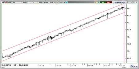 USD/TRY güne 44,08 seviyesinden başlarken, TCMB’nin sıkı likidite adımları kurdaki oynaklığı sınırlıyor. Orta Doğu kaynaklı riskler sürse de, Trump’ın çatışmanın beklenenden kısa sürebileceğine yönelik mesajları ve petroldeki geri çekilme ilk baskıyı bir miktar hafifletti. Buna rağmen kurda yukarı yönlü eğilim korunuyor. 44,00 seviyesi kritik; 44,10 üzerinde 44,20 ve 44,35 direnç, aşağıda 44,00, 43,90 ve 43,80 destek olarak izlenebilir.
