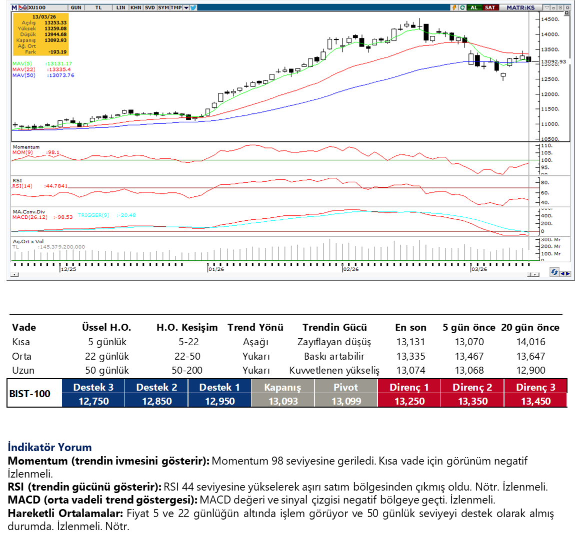 Günaydın. Küresel piyasalar ABD - İran gerilimine odaklanmayı sürdürüyor. Geçtiğimiz haftanın başında savaş ortamının sona edebileceğine dair haber akışı bir miktar tepki getirdi, fakat sonrasında hafta boyunca saldırı haberlerinin devam ettiğini gördük. Burada küresel piyasaların odaklandığı asıl mesele Hürmüz Boğazı'nın durumu, petrol tedariği konusunda bir problem olup olmayacağı ve petrol fiyatlarının seyri. Burada, geçtiğimiz hafta petrol fiyatlarında bir miktar gevşeme olmuştu, fakat hafta sonu İran'ın önemli bir petrol dağıtım merkezi olan Hark Adası’nın vurulması petrol fiyatlarında tekrar 100$ üzerine hareketlere sebep oluyor ve küresel piyasaları zayıflatıyor. Bunlara rağmen, Cuma günü satıcılı olan ABD ve Avrupa borlarına dair vadeli endeks kontratları yeni haftaya tepki arayışı ile başlıyor, Asya borsalarında ise genel olarak satışlar var. Borsa İstanbul’da da bu sabah zayıf bir açılış bekliyoruz. BIST 100 Endeksi, Cuma günü %1,5 azalışla 13.092 puana gerilerken, endekse en fazla pozitif katkı sağlayan ilk beş şirket ENKAI, PETKM, KTLEV, TURSG, SASA; endekse negatif etki edenler ise ASELS, AKBNK, KLRHO, DSTKF, YKBNK oldu. Son bir haftada düzenli para girişi ile dikkat çeken şirketler ise PETKM, TOASO, TURSG ve SISE. Teknik açıdan 12.900 / 13.000 bandı ve 12.400 destek, 13.250 ve 13.450 / 13.550 bandı direnç konumunda. Günün ajandasında içeride merkezi yönetim bütçe dengesi ve Hazine ihaleleri, ABD’de ise sanayi üretimi ve kapasite kullanımı izlenecek. Türkiye 5 yıl vadeli CDS primleri güne 273 baz puandan başlıyor.