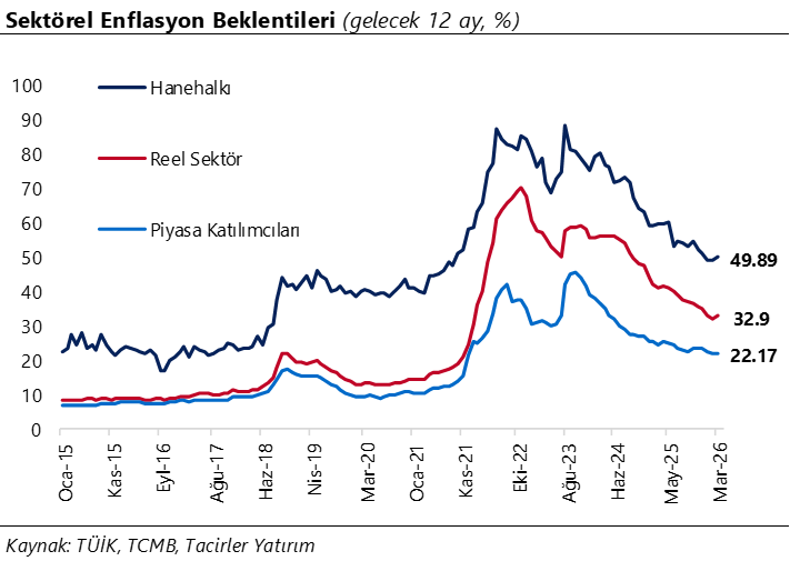 Mart ayı Sektörel Enflasyon Beklentileri Anketi’ne göre enflasyon beklentileri tüm kesimlerde yükseliş gösterdi. Buna göre 12 ay sonrası yıllık enflasyon beklentisi, bir önceki aya kıyasla piyasa katılımcıları için 0,07 puan artarak %22,17, reel sektör için 0,90 puan artarak %32,9, hanehalkı için ise 1,08 puan artarak %49,89 seviyesine yükseldi. Ayrıca, gelecek 12 aylık dönemde enflasyonun düşeceğini bekleyen hanehalkı oranı bir önceki aya göre 5,19 puan azalarak %15,14 seviyesinde gerçekleşirken, enflasyonun artacağını bekleyen hanehalkı oranı ise bir önceki aya göre 5,9 puan artarak %69,23 seviyesine çıktı. Bu görünüm, son dönemde artan jeopolitik riskler ve enerji fiyatlarındaki yükselişin beklentiler üzerindeki etkisinin tüm kesimlere yayıldığına işaret ediyor. Diğer taraftan, yine dün yayınlanan mart ayı Hanehalkı Beklenti Anketi sonuçları, hanehalkının fiyat artış algısı ve beklentisinin özellikle gıda ile yakıt-enerji kalemlerinde yoğunlaştığını gösteriyor. Aynı ankette, 12 ay sonrası konut fiyat artış beklentisi sınırlı bir gerilemeyle %35,05’e inerken, dolar/TL beklentisi 0,59 TL artışla 52,15 TL seviyesine yükseldi.