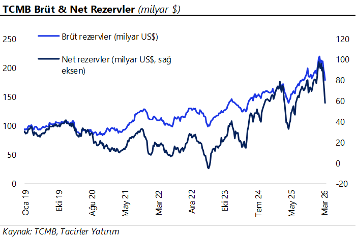 Yabancı yatırımcılar 13 – 19 Mart haftasında hisse senedi piyasasında 137,6 milyon dolar, tahvil piyasasında ise repo işlemleri hariç 130,1 milyon dolar net satış gerçekleştirdi. Yabancıların toplam tahvil stoku içindeki payı ise bu dönemde %6,9’dan %6,7’ye geriledi. Böylece tahvil piyasasında yabancı çıkışı üst üste beşinci haftada da devam ederken, söz konusu dönemde kümülatif çıkış (repo hariç) 5,9 milyar dolara ulaştı. Bununla birlikte, son haftalarda hem hisse senedi hem de tahvil piyasasındaki yabancı çıkışının hız kestiği dikkat çekiyor. Nitekim ABD – İran savaşının başladığı 27 Şubat – 6 Mart haftasında hisse senedi piyasasında 755,6 milyon dolar, tahvil piyasasında ise 1,7 milyar dolarlık çıkış görülürken, 6 – 13 Mart haftasında hisse piyasasında 321,8 milyon dolar, tahvil piyasasında ise 2,9 milyar dolarlık satış gerçekleşmişti. Son veriyle birlikte haftalık çıkışların 130 milyon dolar civarına gerilemesi, yabancı satışlarının kademeli olarak zayıfladığına işaret ediyor. Para & banka istatistikleri cephesinde ise 13 – 19 Mart haftasında yurt içi yerleşiklerin altın hariç parite etkisinden arındırılmış DTH’ları 668 milyon dolar, altın dahil toplam DTH hesapları ise fiyat etkisinden arındırılmış olarak 840 milyon dolar yükseldi. Bu dönemde TCMB brüt döviz rezervi 12,2 milyar dolar azalarak 177,6 milyar dolara, net döviz rezervi ise 11,6 milyar dolar düşüşle 57,3 milyar dolara indi. Brüt döviz rezervleri içindeki altın varlığı ise 134,1 milyar dolardan 116,2 milyar dolara geriledi. Bu dönemde swap stoku 258 milyon dolar azalarak 14,4 milyar dolar olurken, swap hariç net rezerv ise 11,3 milyar dolar gerileyerek 42,9 milyar dolara indi. Ayrıntılı rapor için tıklayınız.