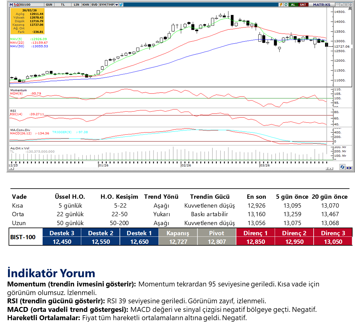 Günaydın. ABD Başkanı Trump’ın İran’ın altyapısına yönelik saldırıları on günlüğüne (6 Nisan’a kadar) askıya almasına karşın petrol fiyatları 100 dolar üzerinde kalmaya devam ediyor. ABD ve Avrupa borsalarında dün gerçekleşen satışların ardından vadeliler bu sabah alıcılı, ancak piyasaların Ortadoğu odaklı tansiyonun yatışması konusunda yeterince ikna olmadıklarını görüyoruz. Bölgeye asker sevkiyatı, karşılıklı saldırı tehditleri, müzakereler için öne sürülen şartların kabul görmemesi gibi nedenlerle hafta sonu riski almak istemeyen yatırımcıların bugün çekimser kalacağını, Borsa İstanbul’da açılışta bir tepki görsek de sonrasında zayıf bir seyir yaşanabileceğini düşünüyoruz. Elbette, gün içinde takip edilecek haber akışı piyasaların seyrinde daha belirleyici olacaktır. BIST 100 Endeksi, dün %1,8 azalışla 12.727 puana gerilerken, endekse en fazla pozitif katkı sağlayan ilk beş şirket RALYH, KCHOL, CCOLA, MAGEN, SASA; endekse negatif etki edenler ise BIMAS, TUPRS, AKBNK, EREGL, YKBNK oldu. Son bir haftada düzenli para girişi ile dikkat çeken şirketler ise KCHOL, AKSA, LILAK ve THYAO. Teknik açıdan 12.400 / 12.500 destek bandı ile 12.800 / 12.900 direnç bölgesi izlenebilir. Günün ajandasında ABD’de büyüme odaklı bazı veriler ve Fed üyelerinin açıklamaları izlenecek, ancak mevcut ortamda bunların piyasa etkisi sınırlı kalabilir. Türkiye 5 yıl vadeli CDS primleri güne 295 baz puandan başlıyor.