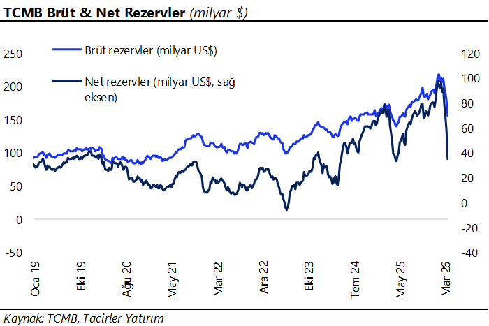 Yabancı yatırımcılar 20 – 27 Mart haftasında hisse senedi piyasasında 137,1 milyon dolar net alım gerçekleştirirken, tahvil piyasasında repo işlemleri hariç 1,4 milyar dolar net satış yaptı. ABD – İran savaşının başladığı 27 Şubat – 6 Mart haftasından bu yana hisse piyasasında üst üste üç hafta net satış yapan yabancıların, bu dönemde sınırlı da olsa yeniden alıma geçtiği görülüyor. Diğer yandan tahvil piyasasında yabancı çıkışı üst üste altıncı haftada da devam ederken, bu dönemde kümülatif çıkış (repo hariç) 7,3 milyar dolara ulaştı. 20 – 27 Mart haftasında yabancıların toplam tahvil stoku içindeki payı ise %6,7’den %6,1’e geriledi. Son bir yıllık kümülatif veriler, hisse senedi piyasasında 3,7 milyar dolarlık net yabancı alımına, tahvil piyasasında repo işlemleri hariç 697 milyon dolarlık sınırlı bir girişe işaret ediyor. Yılbaşından bu yana bakıldığında ise yabancı yatırımcıların hisse senedi piyasasında 1,3 milyar dolar net alım yaptığı, tahvil piyasasında ise repo hariç toplam 1,5 milyar dolarlık çıkışın gerçekleştiği görülüyor. Bu dönemde yurt içi yerleşiklerin altın hariç parite etkisinden arındırılmış DTH’ları 178 milyon dolar gerilerken, altın dahil toplam DTH hesapları ise fiyat etkisinden arındırılmış olarak 2,2 milyar dolar artış kaydetti. 20 – 27 Mart haftasında TCMB brüt döviz rezervi 22,1 milyar dolar azalarak 155,4 milyar dolara, net döviz rezervi 22,3 milyar dolar düşüşle 35 milyar dolara ve swap hariç net rezerv 22,8 milyar dolar gerileyerek 20,1 milyar dolara indi. Ayrıntılı rapor için tıklayınız.