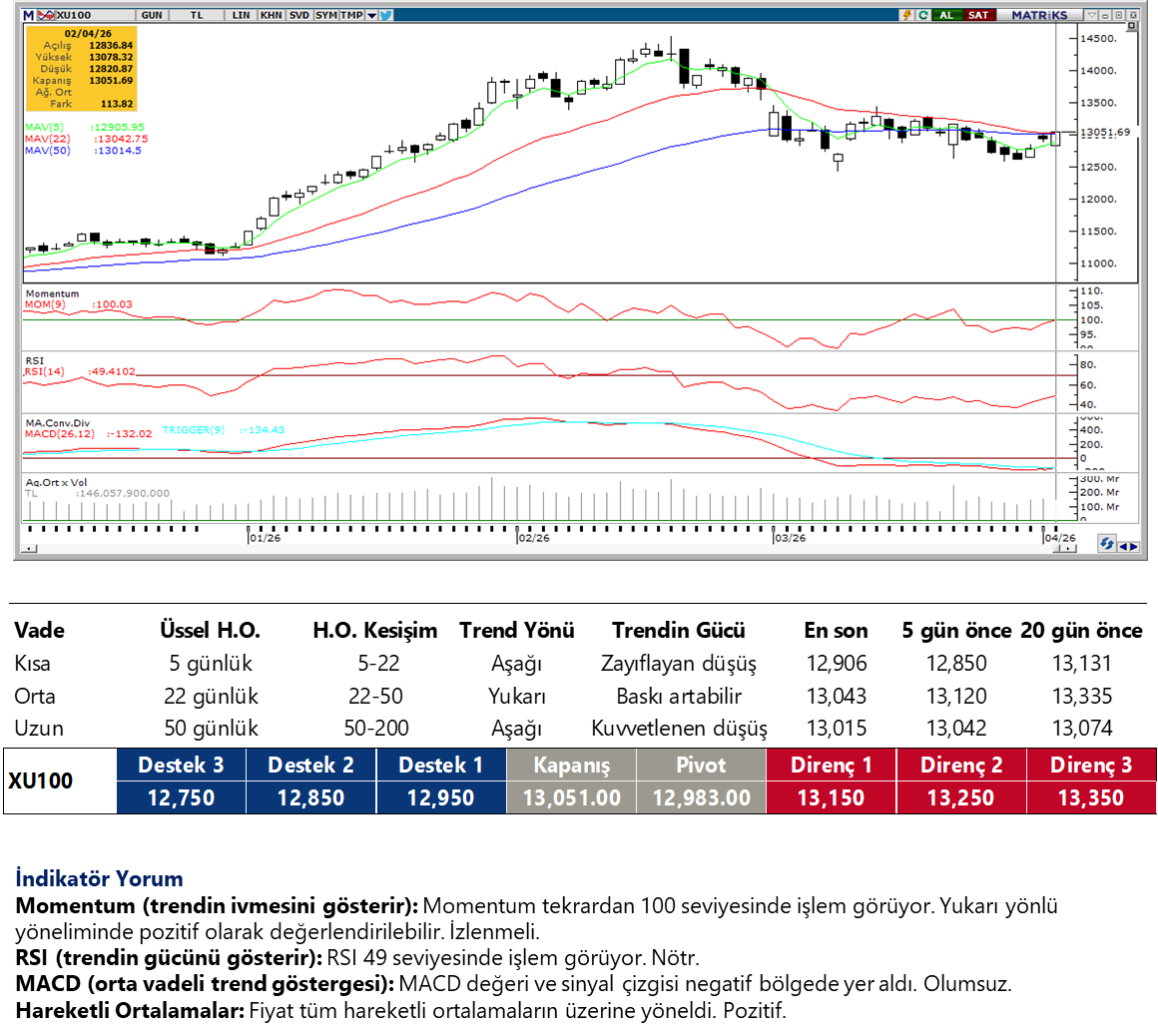 Günaydın. Savaş ortamında dair haber akışı nispeten sakinleşiyor. İran ile Umman’ın Hürmüz Boğazı’nın trafiğini ortak kontrol ve güvenli geçiş için bir protokol üzerinde çalıştığına dair haberler dikkat çekiyor. İran’da inşaat halinde bir köprünün vurulması ve İran’ın da buna karşılık diğer bölge ülkelerindeki köprülerin listesini paylaşması ise stresin devamına neden oluyor. ABD ve Avrupa borsalarında dün karışık kapanışlar vardı, vadeliler bu sabah hafif negatif. Asya boralarında da benzer şekilde karışık bir görünüm var. BIST 100 Endeksi, dün %0,9 artışla 13.052 puana yükselirken, endekse en fazla pozitif katkı sağlayan ilk beş şirket ASELS, BIMAS, ASTOR, DSTKF, AKBNK; endekse negatif etki edenler ise KLRHO, EREGL, KCHOL, FROTO, KUYAS oldu. Son bir haftada düzenli para girişi ile dikkat çeken şirketler ise BIMAS, GARAN, THYAO, TCELL, TAVHL, ULKER, OYAKC ve ISFIN. Teknik açıdan, endeksin 18 Şubat’ta gördüğü tarihi zirveden (14.532) gelen alçalan kanal direncini yukarı kırması ve bu kırılımın teyit edilmesi oldukça pozitif. Yakın vade için 13.300 ara direnç, 13.450 / 13.550 bandı ana direnç olarak izlenebilir. Destekler ise 12.900 ve 12.620. Günün ajandasında içeride Mart ayı enflasyon verileri öne çıkıyor. Ocak ve Şubat rakamlarına göre daha düşük bir aylık TÜFE (%2,1) bekliyoruz. Savaşla birlikte yükselen akaryakıt fiyatlarına rağmen %75’lik eşel mobil sistemi nedeniyle fiyat artışlarının Mart enflasyonu üzerindeki etkisi sınırlı kalacaktır. Nisan ayında daha belirgin etkiler görebiliriz. Gıda enflasyonundaki gerileme ise olumlu tarafta. ABD piyasaları bugün tatil, ancak tarım dışı istihdam verileri açıklanacak. Türkiye 5 yıl vadeli CDS primleri güne 286 baz puandan başlıyor.