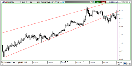 Çapraz kurda temkinli seyir sürüyor. Altı Nisan Hürmüz son tarihinin yaklaşması ve enerji fiyatlarının yeniden yükselmesi EURTRY'de yukarı yönlü baskıyı korurken, euronun dolar karşısında kısmi toparlanması kurda dengeleyici bir unsur olmaya devam ediyor. EURTRY bu sabah 51,50 seviyesinde; yurt içinde yüksek faiz ve sıkı likidite koşulları sert hareketleri sınırlıyor. Teknik olarak 51,55, 51,75 ve 52,00 direnç; 51,35, 51,20 ve 51,00 destek olarak takip edilebilir.
