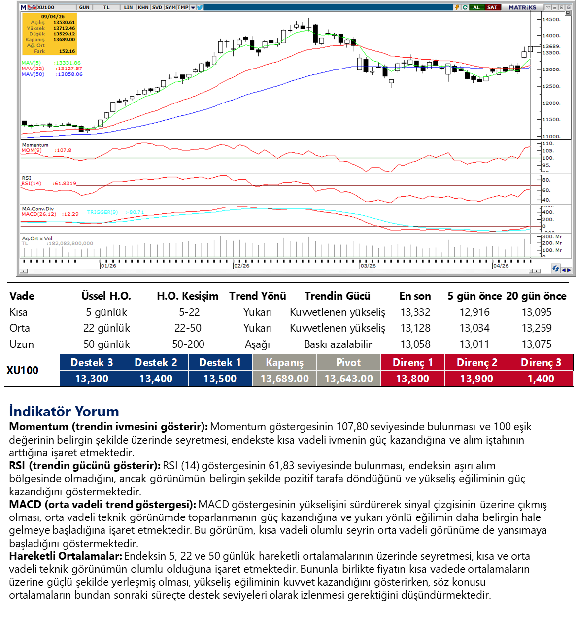 Günaydın. ABD ve İran arasındaki iki haftalık ateşkes sürecinde bazı aksaklık ve ihlallere karşın piyasa iyimserliği devam ediyor. Petrol fiyatlarında, ateşkes haberi ile 90 doların altına yaşanan ilk hareket hız kesti, ancak yine de gevşeme eğilimi devam ediyor. ABD ve Avrupa vadeleri ile Asya borsaları bu sabah genel olarak alıcılı. Borsa İstanbul'da, Mart başında savaşın başlamasıyla beraber 13.450 / 13.550 bandında oluşan boşluk bölgesi yukarı yönde aşıldı ve BIST 100 endeksinin yönünü tekrar 14.000 ve üzerine çevirdiğini görüyoruz. Elbette bunun gerçekleşmesi için ateşkes sürecinin sıkıntısız bir şekilde ilerlemesi ve kalıcı barışa dönüşmesi önemli olacaktır. Bu kapsamda yarından itibaren Pakistan'da gerçekleşmesi beklenen ABD - İran müzakereleri yakında izlenmeli. BIST 100 Endeksi, dün %1,1 artışla 13.689 puana yükselirken, endekse en fazla pozitif katkı sağlayan ilk beş şirket ASELS, BIMAS, TUPRS, TCELL, ISCTR; endekse negatif etki edenler ise KTLEV, AKBNK, KCHOL, KLRHO, SASA oldu. Son bir haftada düzenli para girişi ile dikkat çeken şirketler ise ASELS, BIMAS, MGROS, KUYAS ve TSPOR. Borsa İstanbul’da bu sabah pozitif açılış bekliyoruz, petrol fiyatlarının dün akşam kapanış dakikalarımızdan bu yana bakıldığında yaklaşık %3 aşağıda işlem görmesi BIST için de destekleyici olacaktır. Teknik açıdan 13.960 ve 14.100 / 14.200 bölgesi direnç, 13.530 ve 13.330 destek olarak izlenebilir. Günün ajandasında içeride Şubat ayı sanayi üretim verisi izlenecek, bir miktar toparlanma bekliyoruz. ABD’de Mart TÜFE verileri izlenecek. Yıllık TÜFE’nin %2,4’ten %3,4’e sert bir yükseliş kaydetmesi bekleniyor. Türkiye 5 yıl vadeli CDS primleri güne 237 baz puandan başlıyor.