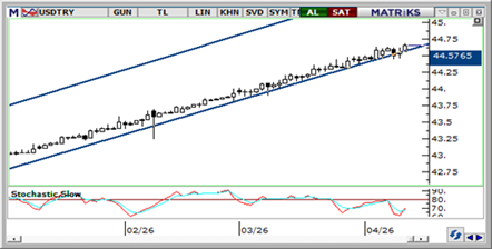 Yükseliş kanalı içerisindeki hareketini sürdüren kurda, trend ve momentum indikatörleri kademeli yukarı yönlü eğilimin devamına işaret ediyor. Analitik bilanço üzerinden yaptığımız hesaplamalarda, bu hafta TCMB’nin net döviz pozisyonunun arttığını takip ediyoruz. TCMB’nin rezerv yönetimi devam ederken, içeride %40’ta kalan piyasa faizleri kurda sert yükselişler önünde engel teşkil etmeye devam ediyor. Kurda 44,65, 44,75 ve 44,85 seviyeleri direnç, 44,50, 44,40 ve 44,30 destek olarak izleniyor.