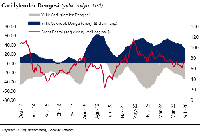 Cari işlemler dengesi, şubat ayında 7,5 milyar dolar açık vererek 7,4 milyar dolar olan kurum tahminimize yakın bir gerçekleşme gösterdi. Böylelikle 12-aylık cari açık 33,2 milyar dolardan 35,5 milyar dolara çıktı. Altın ve enerji hariç cari işlemler hesabı (çekirdek denge) şubat ayında 1,5 milyar dolar açık verirken, buradaki yıllık fazla ise 33,6 milyar dolardan 30,8 milyar dolara geriledi. Cari işlemler dengesinin mart ayında 10,4 milyar dolar açık vermesini bekliyoruz. Mart ayında ödemeler dengesi tanımlı dış ticaret açığının 9,9 milyar dolara yükseleceğini, seyahat kaleminden kaynaklanan net gelirin sınırlı bir artışla 2,1 milyar dolar olarak gerçekleşeceğini hizmetler dengesi fazlasının ise 2,4 milyar dolar civarında oluşacağını tahmin ediyoruz. ABD – İran gerilimi sonrasında artan enerji fiyatları çerçevesinde, yıl sonu cari işlemler açığı tahminimizi 45 milyar dolar seviyesine (GSYİH’nın %2,6’sı) revize ettik. Ancak, küresel enerji maliyetlerinde korunan yüksek seviyeler ve devam eden belirsizlik ortamı çerçevesinde, tahminimize yönelik risklerin yukarı yönlü olduğunu not ediyoruz. Ayrıntılı rapor için tıklayınız.