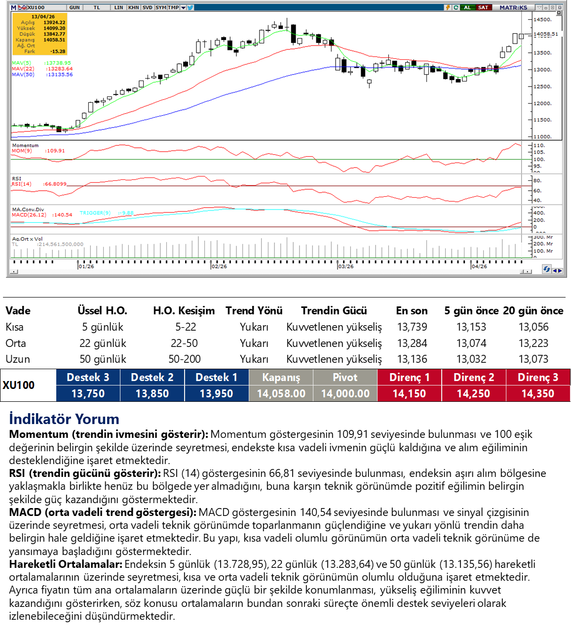 Günaydın. ABD ve İran arasında görüşmelerin Perşembe günü devam edebileceği haberleri ve Hürmüz Boğazı etrafındaki ablukaya rağmen bölgeden olumsuz bir haber akışı oluşmaması bu sabah küresel risk iştahını destekliyor. ABD ve Avrupa vadelileri hafif pozitif, Asya borsalarında ise daha belirgin alımlar görüyoruz. Petrol fiyatlarında da 95 dolar altına gevşeme yaşanıyor. Borsa İstanbul'da dün güne zayıf bir başlangıç yaşanmasına rağmen, günün devamında yukarı yönlü eğilim gördük. İşlem hacmindeki artış ve sınırlı para çıkışı ile beraber BIST 100 endeksinin yeniden 14.000 üzerinde kapanması olumlu. Dünkü kapanış saatimizden bu sabaha baktığımızda petrol fiyatlarında yaklaşık %3 gerileme hesaplıyoruz, bu nedenle Borsa İstanbul'da bugün de pozitif seyrin devam edebileceğini ve 14.100 / 14.200 bölgesine bir tırmanış görebileceğimizi düşünüyoruz. Dün endekse en fazla pozitif katkı sağlayan ilk beş şirket ASELS, TUPRS, EREGL, PETKM, MPARK olurken; endekse negatif etki edenler ise THYAO, SAHOL, TAVHL, BIMAS, AKBNK oldu. Son bir haftada düzenli para girişi ile dikkat çeken şirketler ise ASELS, ISCTR, GARAN, TKFEN, PGSUS ve ARCLK. Teknik açıdan 14.200 ve 14.530 dirençleri ile 13.800 / 13.900 destek bölgesi izlenebilir. Günün ajandasında içeride Hazine ihaleleri, ABD’de ÜFE verileri ve Fed üyelerinin açıklamaları izlenecek. ABD’de yıllık ÜFE’nin Mart ayında %3,4’ten %4,6’ya belirgin şekilde yükseldiği tahmin ediliyor. Fed’in bu ortamda faiz indirmesi zor, ancak Mayıs’tan sonra değişecek yönetimin nasıl bir yol izleyeceği takip edilecektir. Son olarak, Türkiye 5 yıl vadeli CDS primleri güne 238 baz puandan başlıyor.