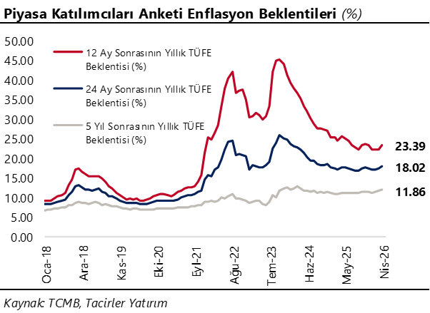 TCMB’nin Nisan 2026 dönemine ilişkin Piyasa Katılımcıları Anketi yayımlandı. Katılımcıların 2026 yıl sonu TÜFE beklentisi %25,4’ten %27,5’e, 2027 yıl sonu beklentisi ise %18,7’den %20,1’e yükseldi. 12 ay sonrasına ilişkin TÜFE beklentisi %22,2’den %23,4’e çıkarken, 24 ay sonrasına ilişkin beklenti %17,3’ten %18’e, 5 yıl sonrasına ilişkin beklenti ise %11,6’dan %11,9’a yükseldi. Katılımcıların aylık TÜFE artışı beklentileri nisan ayı için %2,9, mayıs ve haziran ayları için ise sırasıyla %1,8 ve %1,5 seviyelerinde oluştu. Nisan ayı aylık TÜFE artışının %3,3 civarında oluşacağını tahmin ediyoruz. Kurum tahminimiz paralelinde bir aylık TÜFE artışı, yıllık TÜFE’yi %30,9 seviyesinden %31,3’e taşıyacak. Yıl sonu TÜFE tahminimiz %28 seviyesinde. Piyasa katılımcıları, 22 Nisan’daki PPK toplantısında politika faizinin %37,75 seviyesinde oluşmasını bekliyor. 11 Haziran ve 23 Temmuz toplantılarına ilişkin beklentiler sırasıyla %37,4 ve %36,5 seviyesinde. 2026 yıl sonu politika faizi beklentisi ise %30,6’dan %32,9’a yükselmiş durumda. 22 Nisan’daki PPK toplantısında, %37 seviyesinde bulunan politika faizinin, halihazırda piyasa fonlamasının gerçekleştiği %40 seviyesine çekilmesini bekliyoruz. Bu adımla birlikte faiz koridorunun üst bandının %43’e çıkacağını ve fonlamanın yeniden haftalık repo ihaleleri üzerinden yapılacağını öngörüyoruz. Bu çerçevede, mevcutta %40 civarında oluşan piyasa faizinde efektif bir değişim beklemiyoruz. Bununla birlikte, bu adımın en önemli sinyalinin, gerekli olması halinde üst bant üzerinden ilave 300 baz puanlık sıkılaşma alanının korunması olacağını değerlendiriyoruz. Bu çerçevede, baz senaryomuz politika faizinin piyasa faiziyle uyumlu bir seviyeye çekilmesi ve efektif faiz koşullarında bir değişikliğe gidilmemesi yönünde. Bununla birlikte, TCMB’nin politika faizini sabit tutarak üst banttan fonlamaya devam etmesi ihtimalini de göz ardı etmiyoruz. Yıl sonu politika faizi beklentimiz %35 seviyesinde bulunuyor. Ayrıntılı rapor için tıklayınız.