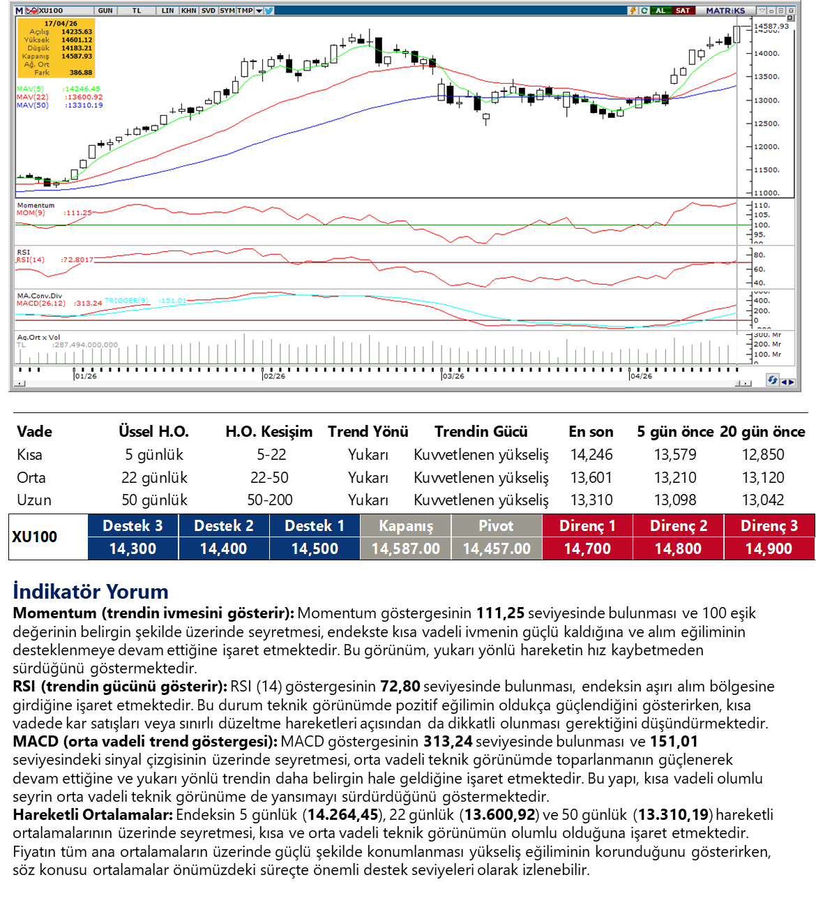 Günaydın, iyi haftalar. Cuma günü kapanışa doğru Hürmüz Boğazı'nın açıldığına dair haber akışı küresel piyasalarda çok belirgin bir iyimserlik yaratmıştı. Petrol fiyatlarında gerileme ve zirve tazeleyen borsalar izlemiştik. Fakat hafta sonu, ABD’nin Hürmüz Boğazı'ndaki ablukasının devam etmesi ve İran'ın bu nedenle boğazı tekrar kapattığını açıklaması ve bazı gemilere düzenlenen saldırılar yeni haftaya tekrar olumsuz bir atmosferle başlamamıza sebep oluyor. Petrol fiyatlarında 85 dolar civarına geri çekilmeler görmüştük, yeni haftaya ise tekrar 92 dolar civarında başlıyoruz. ABD ve Avrupa vadelileri satıcılı, Asya borsaları cuma günkü olumlu havayı bu sabah fiyatlıyor fakat orada da momentum kaybı görüyoruz. Borsa İstanbul'da 14.600’e tırmanarak rekor tazelendi, yeni haftaya ise zayıf bir başlangıç bekliyoruz. Teknik açıdan 14.300 / 14.400 bölgesi ilk destek alanı olarak takip edilebilir; 14.600 / 14.680 bölgesi ise ilk direnç alanı. Cuma günü %2,7 yükselen endekse en fazla pozitif katkı sağlayan ilk beş şirket AKBNK, THYAO, BIMAS, DSTKF, SAHOL; endekse negatif etki edenler ise TUPRS, PETKM, KUYAS, AKSEN, CWENE oldu. Son bir haftada düzenli para girişi ile dikkat çeken şirketler ise AKBNK, KCHOL ve ULKER. Yüksek hacim, güçlü para girişi ve yabancı alımları nedeniyle BIST’teki geri çekilmelerin sınırlı kalabileceğini düşünüyoruz, ancak 14.000 / 14.100 bölgesi alına sarkma halinde görünüm daha olumsuza dönebilir. Günün ajandası sakin. Türkiye 5 yıl vadeli CDS primleri güne 228 baz puandan başlıyor.