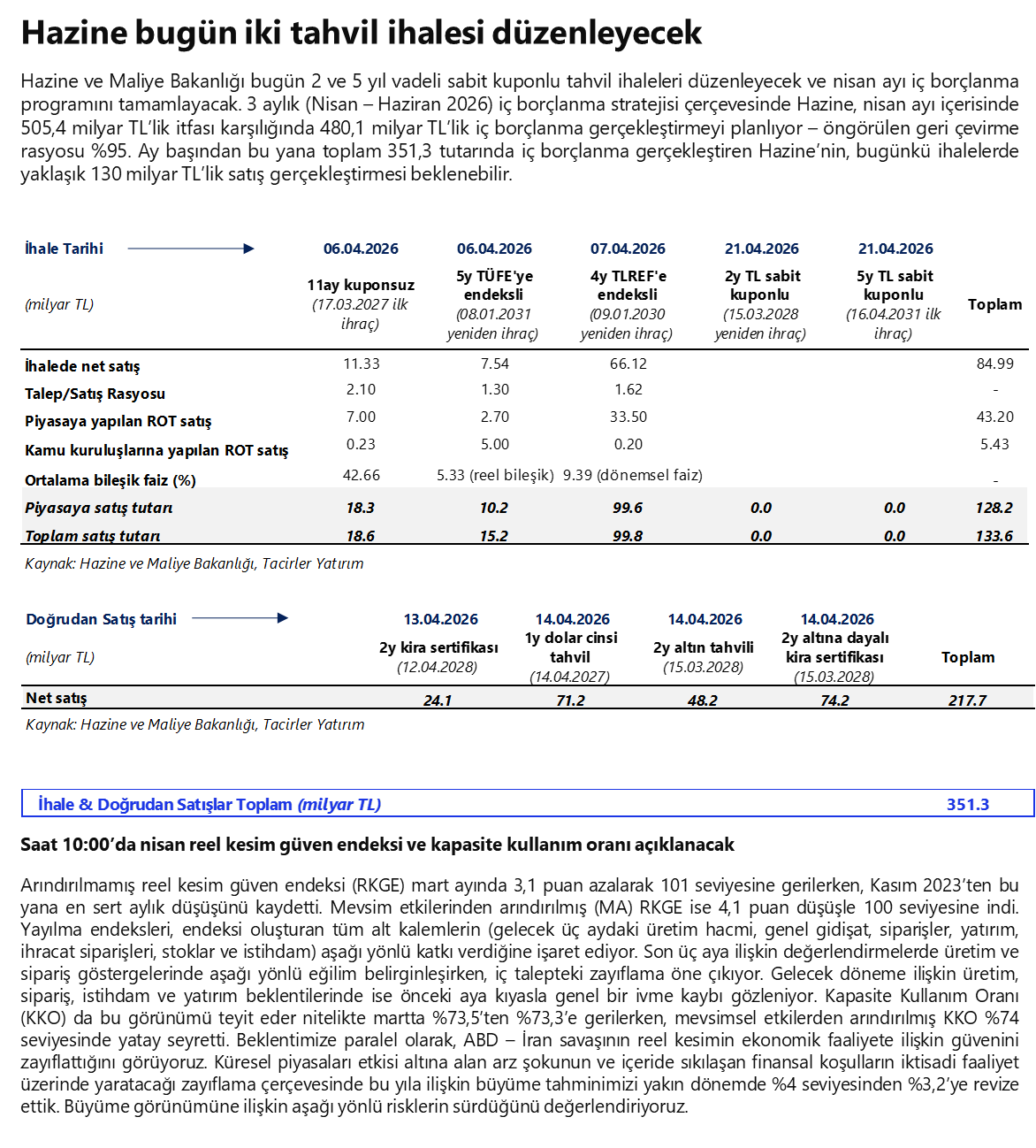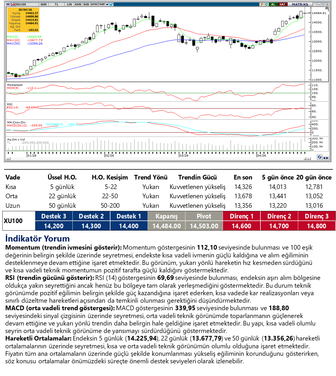 Günaydın. ABD - İran arasında müzakerelerin devam edip etmeyeceğine dair belirsizlik sürüyor. İran, Hürmüz Boğazı’ndaki ABD ablukasının kaldırılmasını bir şart olarak öne sürerken, ABD tarafı da ablukanın kalkması için önce bir uzlaşma şartı ortaya koyuyor. Petrol fiyatları, olası bir anlaşma ihtimalini fiyatlarken son işlemler 90 dolara yakın seviyelerden gerçekleşiyor. Dün satış gören ABD ve Avrupa vadelileri ile Asya borsaları bu sabah genel olarak alıcılı. Borsa İstanbul’da, Cuma günü yaklaşık 400 puana yakın yükselişin ardından dün bunun sadece 100 puanı geri verildi. Yeniden sıcak çatışma haberleri oluşmadıkça ve petrol fiyatları 100 dolar üzerine tırmanmadıkça BIST’teki geri çekilmelerin sınırlı kalacağını, Mart ayındaki satışlara ve yabancı çıkışına karşın uzun süredir takip edilen kümülatif para girişinin Borsa İstanbul’u desteklemeye devam edeceğini düşünüyoruz. BIST 100 Endeksi, dün %0,7 azalışla 14.485 puana gerilerken, endekse en fazla pozitif katkı sağlayan ilk beş şirket EREGL, KTLEV, ASTOR, RALYH, DSTKF; endekse negatif etki edenler ise ASELS, AKBNK, BIMAS, KLRHO, TCELL oldu. Son bir haftada düzenli para girişi ile dikkat çeken şirketler ise PETKM, TTKOM, FROTO ve ULKER. Teknik açıdan 14.550 / 14.610 bölgesi ilk direnç alanı ve bugün test edilebilir. Aşılması için gün içi gelişmeler izlenmeli. Mevcut momentumun, BIST 100 endeksini 2-4 haftalık bir periyotta 15 bin civarına taşıyabilecek güçte olduğunu düşünüyoruz. Destekler ise 14.000 / 14.200 bölgesi ve 13.800. Günün ajandasında içeride reel sektör güveni ve kapasite kullanımı, ABD’de perakende satışlar ve bekleyen konut satışları izlenecek. Türkiye 5 yıl vadeli CDS primleri güne 230 baz puandan başlıyor.