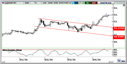 53 civarından gelen kar realizasyonları ile birlikte geri çekilen EURTRY, bu sabah saatlerinde 52,95 seviyesinin hemen altında işlem görüyor. Teknik göstergeler kademeli yükseliş eğiliminin devamına işarete derken, yakın vade için 52,50 – 53,50 bandında bir hareket ihtimalini destekliyor. EURTRY’de 53 ve 53,13 seviyeleri direnç, aşağıda 52,74 ve 52,50 seviyeleri ise destek olarak izlenecek.