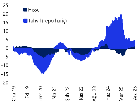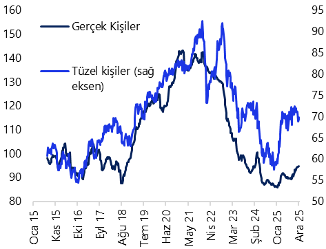 Yabancı yatırımcılar, 12 – 19 Aralık haftasında hisse senedi piyasasında 354,5 milyon dolar, tahvil piyasasında ise repo işlemleri hariç 202,8 milyon dolar tutarında net alım gerçekleştirdi. Bu dönemde yabancıların tahvil stoku içindeki payı %7,3 seviyesinde %7,4’e çıktı. Yılbaşından bu yana bakıldığında, yabancı yatırımcıların hisse senedi piyasasında 2 milyar dolar, repo işlemleri hariç tahvil piyasasında ise toplam 3,1 milyar dolarlık net alım yaptığı görülüyor. Kasım ayı boyunca tahvil piyasasında repo işlemleri hariç 2 milyar dolar tutarında alım yapan yabancıların, aralık başından bu yana da toplamda 520 milyon dolarlık giriş ile alımlarına devam ettiği görülüyor. Hisse senedi piyasasında ise aralık ayı başından bu yana kümülatif girişi 500 milyon doları aşmış durumda. 2026 boyunca devam etmesini beklediğimiz faiz indirimleri ve siyasi risk algısındaki kademeli normalleşme çerçevesinde, standart portföy kanallarına yönelik yabancı ilgisinin güçlenebileceğini değerlendiriyoruz.